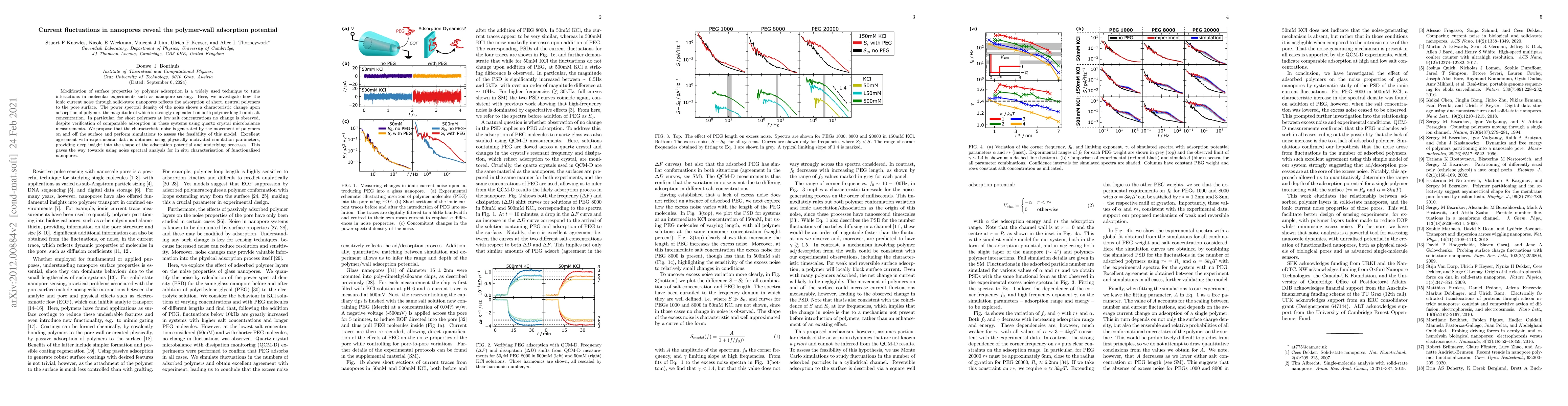 This study investigates how ionic current noise through nanopores reflects polymer adsorption to the pore surface, revealing a characteristic change in the power spectral density dependent on polymer length and salt concentration. Simulations confirm the noise is generated by polymer movement on and off the surface, offering insights into the adsorption potential and paving the way for in situ characterization of functionalised nanopores.