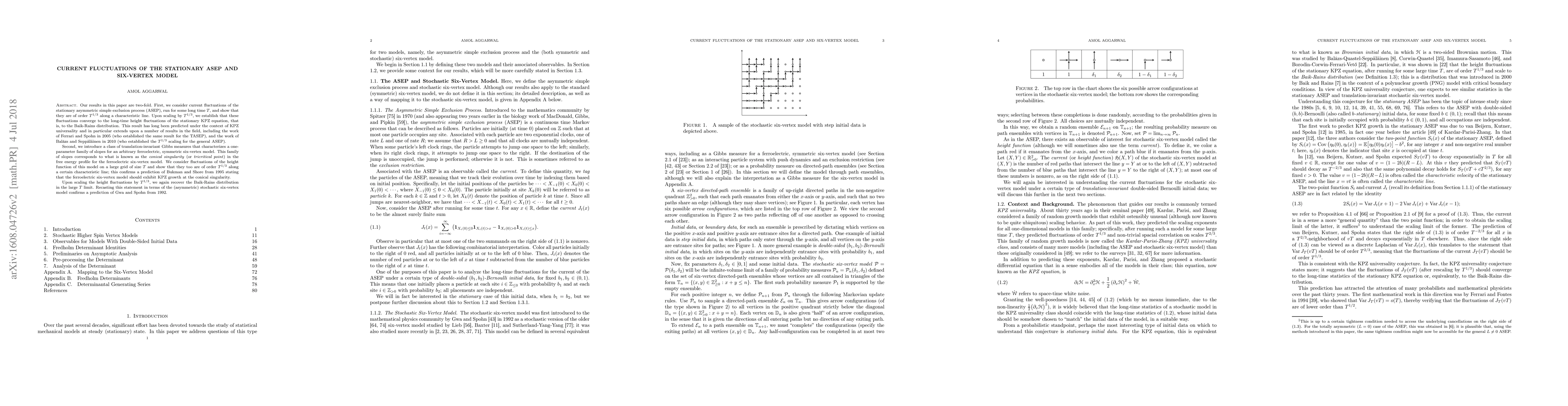 This paper investigates current fluctuations in the stationary asymmetric simple exclusion process (ASEP) and the ferroelectric six-vertex model, showing both exhibit $T^{1/3}$ scaling for large times $T$. Both systems converge to the Baik-Rains distribution upon appropriate scaling, confirming predictions of KPZ universality.