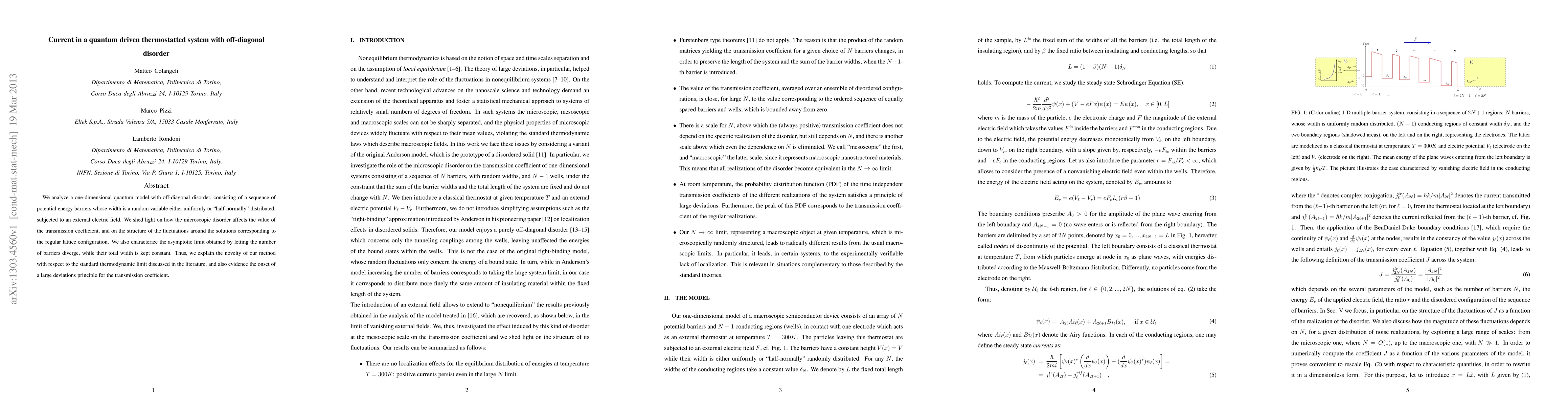 We analyze a one-dimensional quantum model with off-diagonal disorder, consisting of a sequence of potential energy barriers whose width is a random variable either uniformly or "half-normally" distributed, subjected to an external electric field. We shed light on how the microscopic disorder affects the value of the transmission coefficient, and on the structure of the fluctuations around the solutions corresponding to the regular lattice configuration. We also characterize the asymptotic limit obtained by letting the number of barriers diverge, while their total width is kept constant. Thus, we explain the novelty of our method with respect to the standard thermodynamic limit discussed in the literature, and also evidence the onset of a large deviations principle for the transmission coefficient.