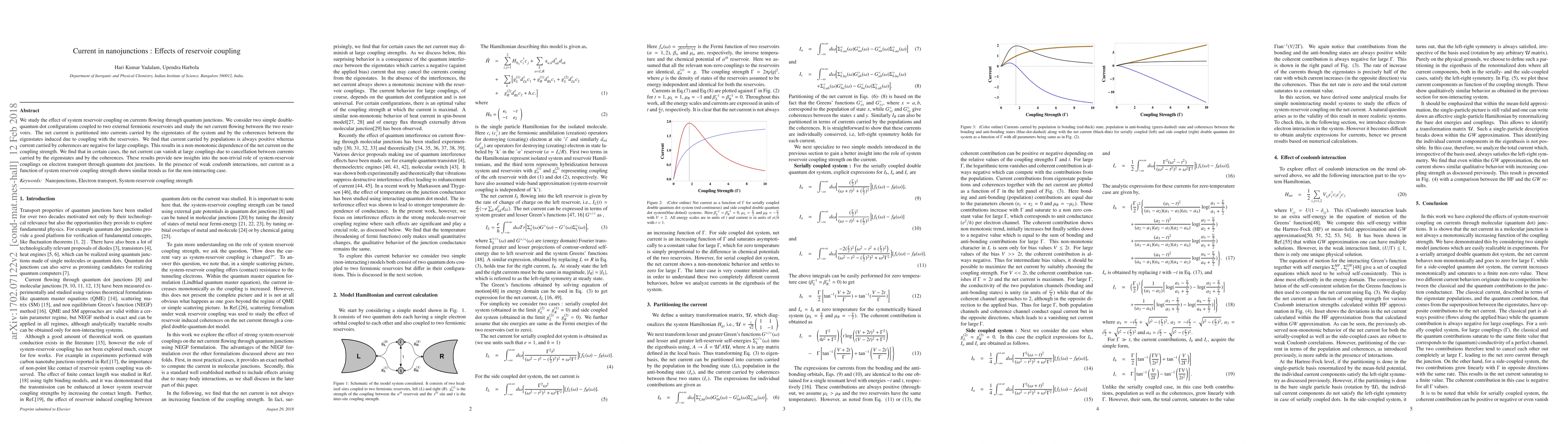 We study the effect of system reservoir coupling on currents flowing through quantum junctions. We consider two simple double-quantum dot configurations coupled to two external fermionic reservoirs and study the net current flowing between the two reservoirs. The net current is partitioned into currents carried by the eigenstates of the system and by the coherences between the eigenstates induced due to coupling with the reservoirs. We find that current carried by populations is always positive whereas current carried by coherences are negative for large couplings. This results in a non-monotonic dependence of the net current on the coupling strength. We find that in certain cases, the net current can vanish at large couplings due to cancellation between currents carried by the eigenstates and by the coherences. These results provide new insights into the non-trivial role of system-reservoir couplings on electron transport through quantum dot junctions. In the presence of weak coulomb interactions, net current as a function of system reservoir coupling strength shows similar trends as for the non-interacting case.