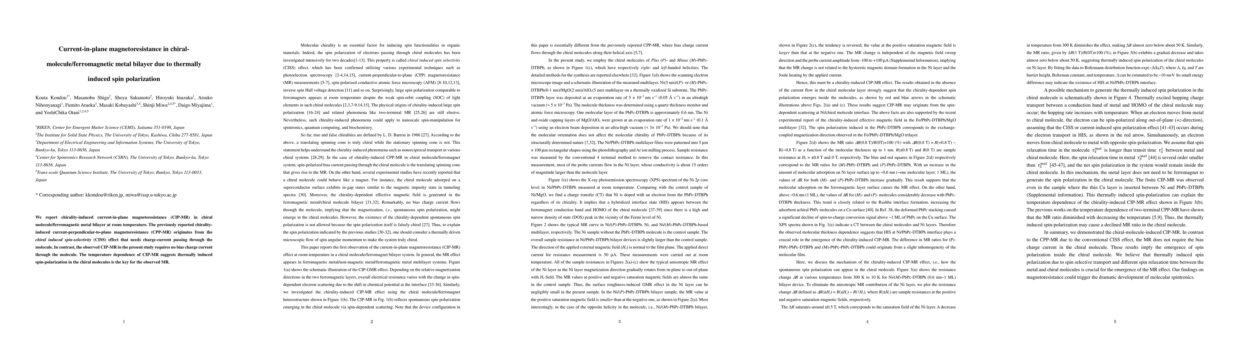 Summary: This study reports current-in-plane magnetoresistance (CIP-MR) in chiral molecule/ferromagnetic metal bilayers at room temperature, contrasting with previous perpendicular magnetoresistance due to thermally induced spin polarization in the chiral molecules, rather than requiring a bias charge current.