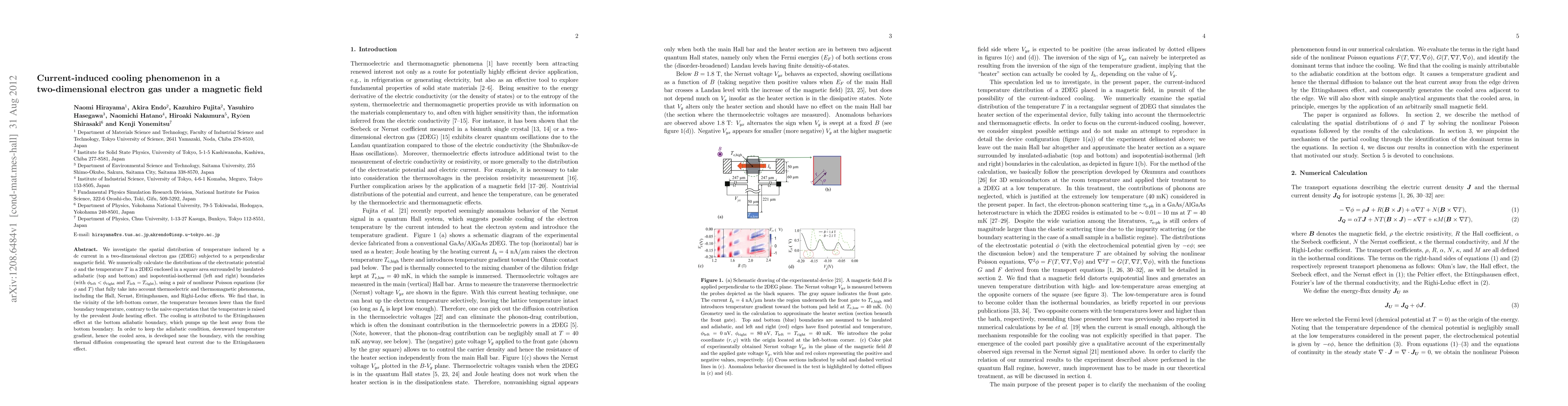 We investigate the spatial distribution of temperature induced by a dc current in a two-dimensional electron gas (2DEG) subjected to a perpendicular magnetic field. We numerically calculate the distributions of the electrostatic potential phi and the temperature T in a 2DEG enclosed in a square area surrounded by insulated-adiabatic (top and bottom) and isopotential-isothermal (left and right) boundaries (with phi_{left} < phi_{right} and T_{left} =T_{right}), using a pair of nonlinear Poisson equations (for phi and T) that fully take into account thermoelectric and thermomagnetic phenomena, including the Hall, Nernst, Ettingshausen, and Righi-Leduc effects. We find that, in the vicinity of the left-bottom corner, the temperature becomes lower than the fixed boundary temperature, contrary to the naive expectation that the temperature is raised by the prevalent Joule heating effect. The cooling is attributed to the Ettingshausen effect at the bottom adiabatic boundary, which pumps up the heat away from the bottom boundary. In order to keep the adiabatic condition, downward temperature gradient, hence the cooled area, is developed near the boundary, with the resulting thermal diffusion compensating the upward heat current due to the Ettingshausen effect.