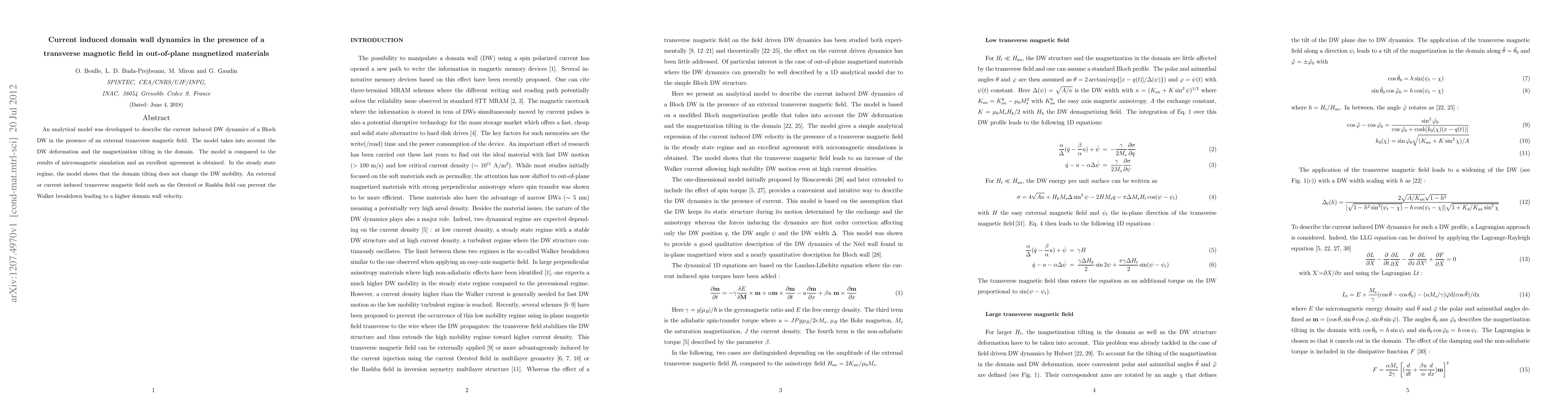 This paper presents an analytical model for current-induced domain wall dynamics in out-of-plane magnetized materials under a transverse magnetic field, showing good agreement with micromagnetic simulations. The model reveals that domain tilting does not affect wall mobility, and transverse fields can prevent Walker breakdown, enhancing domain wall velocity.