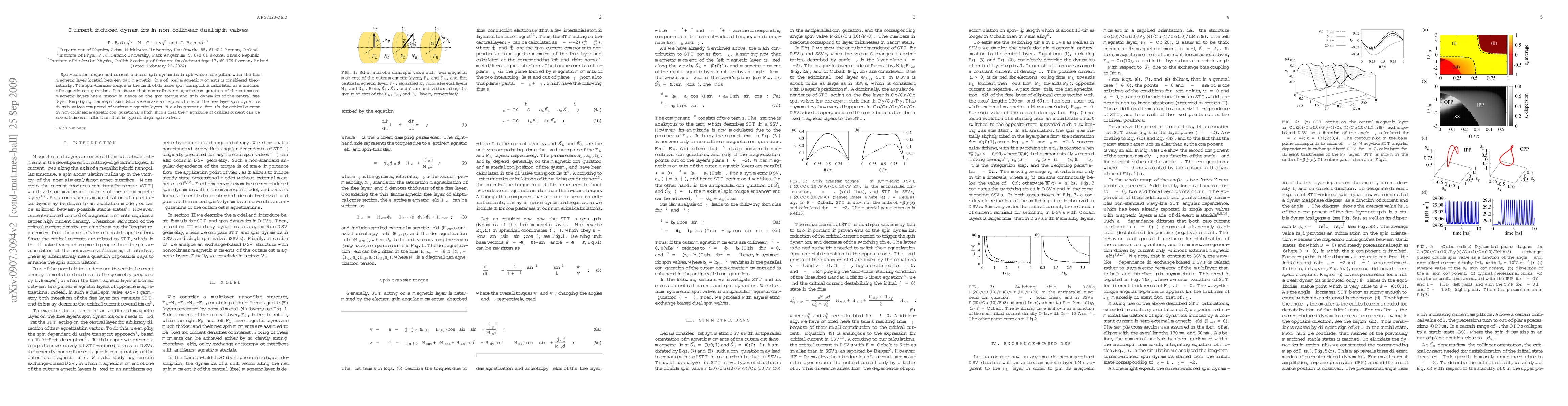 This paper theoretically investigates current-induced spin dynamics in non-collinear dual spin-valves, demonstrating that the outermost magnetic layers' non-collinear configuration significantly affects the spin torque and dynamics of the central free layer. The study also proposes a formula for the critical current, revealing it can be substantially lower in non-collinear configurations compared to typical single spin valves.
