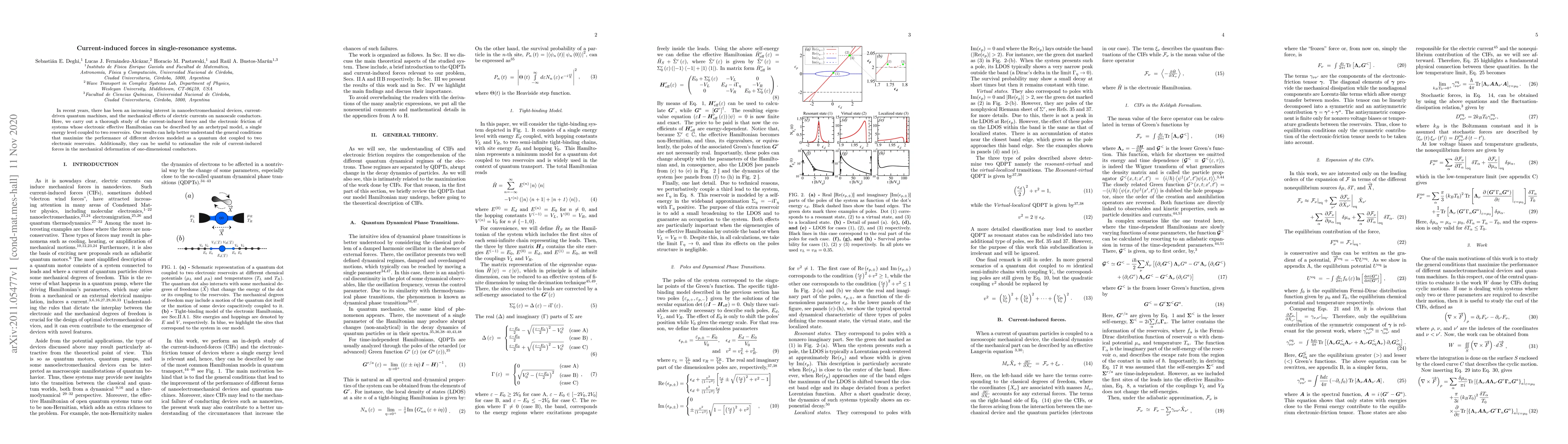 This paper investigates current-induced forces and electronic friction in single-resonance quantum systems modeled by a single energy level connected to two reservoirs, aiming to optimize nanoelectromechanical device performance and understand current-driven mechanical effects in nanoconductors.
