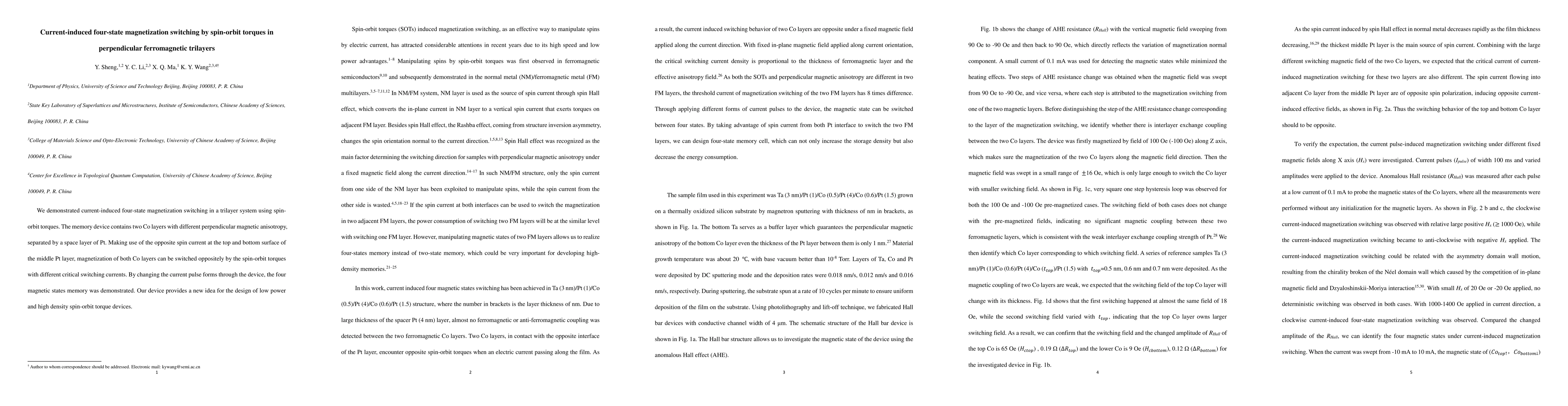 This paper demonstrates a trilayer system enabling current-induced four-state magnetization switching via spin-orbit torques, using two Co layers with distinct magnetic anisotropy separated by a Pt spacer. The device can switch the magnetization of both Co layers oppositely with different critical currents, achieving four magnetic states and suggesting a novel approach for low power, high-density spin-orbit torque memory devices.