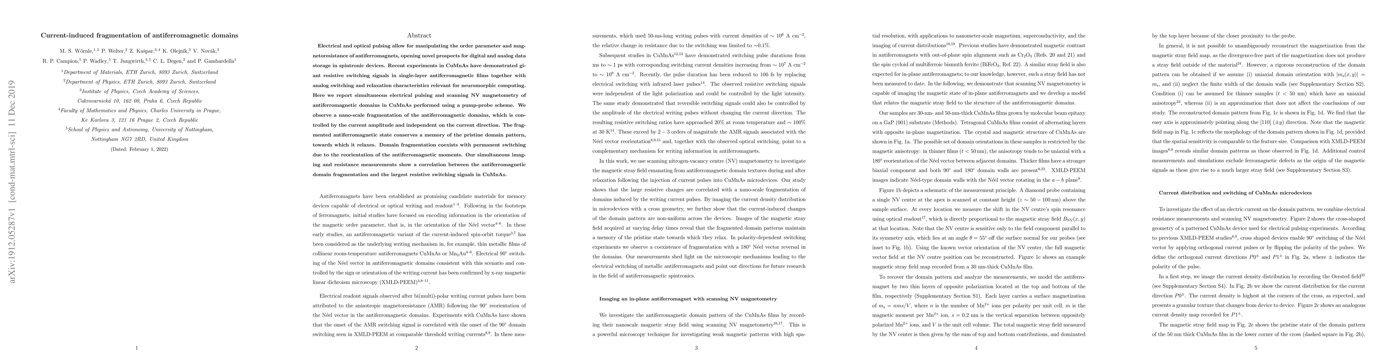 Electrical and optical pulsing allow for manipulating the order parameter and magnetoresistance of antiferromagnets, opening novel prospects for digital and analog data storage in spintronic devices. Recent experiments in CuMnAs have demonstrated giant resistive switching signals in single-layer antiferromagnetic films together with analog switching and relaxation characteristics relevant for neuromorphic computing. Here we report simultaneous electrical pulsing and scanning NV magnetometry of antiferromagnetic domains in CuMnAs performed using a pump-probe scheme. We observe a nano-scale fragmentation of the antiferromagnetic domains, which is controlled by the current amplitude and independent on the current direction. The fragmented antiferromagnetic state conserves a memory of the pristine domain pattern, towards which it relaxes. Domain fragmentation coexists with permanent switching due to the reorientation of the antiferromagnetic moments. Our simultaneous imaging and resistance measurements show a correlation between the antiferromagnetic domain fragmentation and the largest resistive switching signals in CuMnAs.