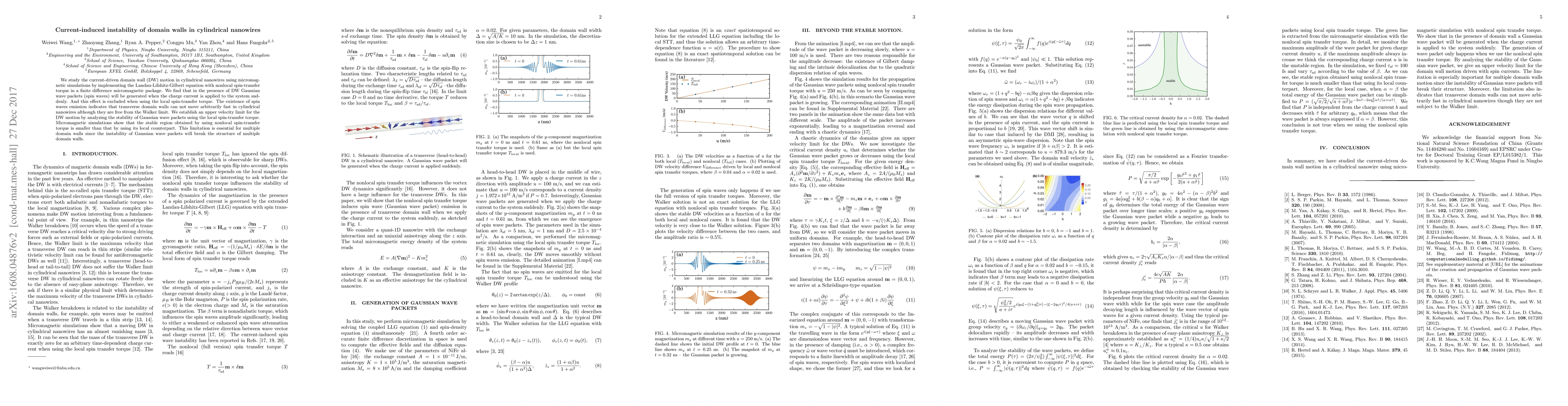 The research examines current-induced domain wall motion in cylindrical nanowires using micromagnetic simulations, revealing that nonlocal spin-transfer torque generates Gaussian wave packets (spin waves), imposing an upper-velocity limit on domain wall movement and reducing stability compared to local spin-transfer torque.