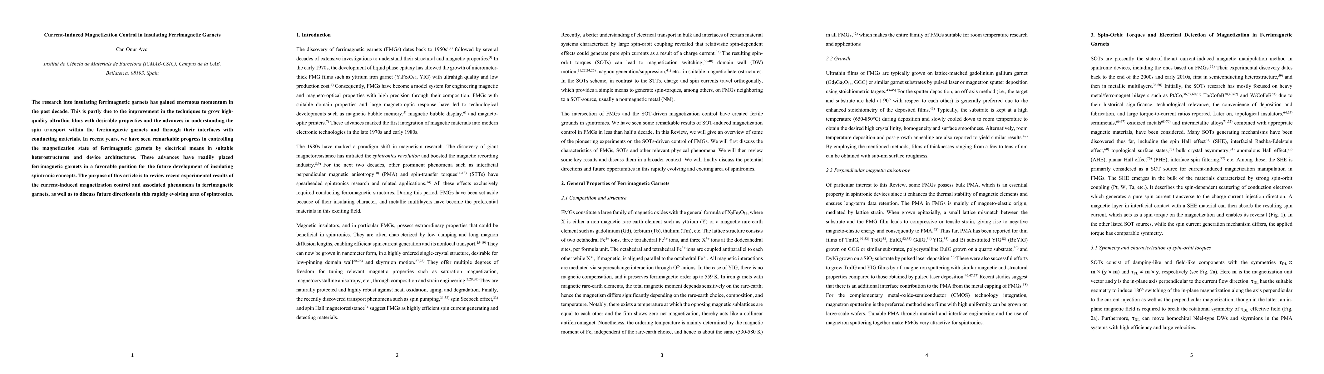 This paper reviews recent experimental advances in controlling the magnetization of insulating ferrimagnetic garnets via electrical current, highlighting the role of heterostructures and interfaces, and discusses future potential in spintronic applications. The study emphasizes the progress made and possible directions for future research in this evolving area of spintronics.