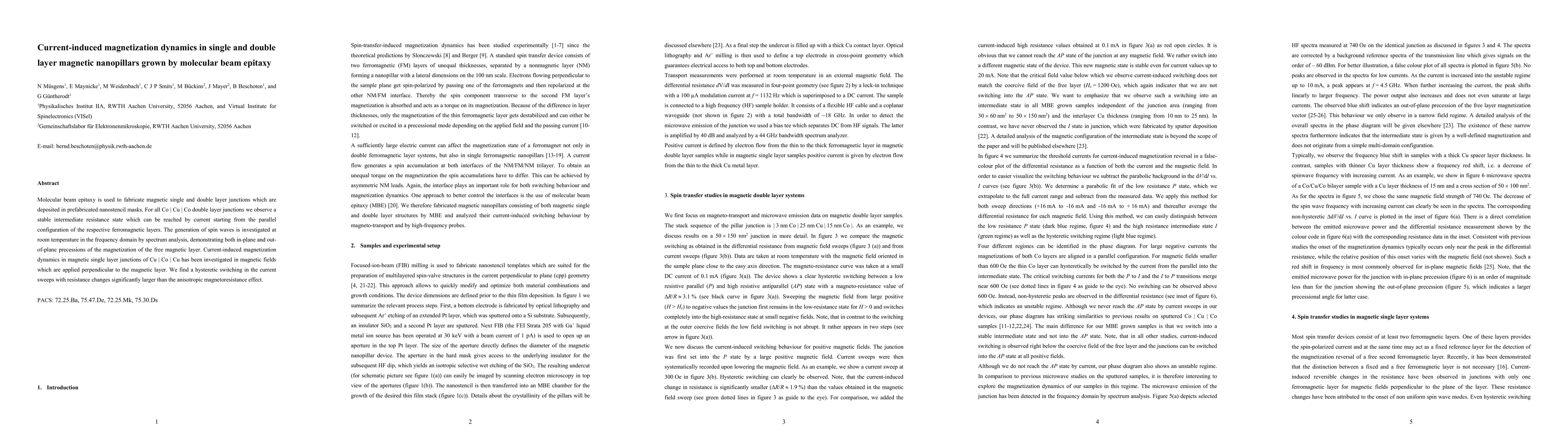 Molecular beam epitaxy is used to fabricate magnetic single and double layer junctions which are deposited in prefabricated nanostencil masks. For all Co | Cu | Co double layer junctions we observe a stable intermediate resistance state which can be reached by current starting from the parallel configuration of the respective ferromagnetic layers. The generation of spin waves is investigated at room temperature in the frequency domain by spectrum analysis, demonstrating both in-plane and out-of-plane precessions of the magnetization of the free magnetic layer. Current-induced magnetization dynamics in magnetic single layer junctions of Cu | Co | Cu has been investigated in magnetic fields which are applied perpendicular to the magnetic layer. We find a hysteretic switching in the current sweeps with resistance changes significantly larger than the anisotropic magnetoresistance effect.