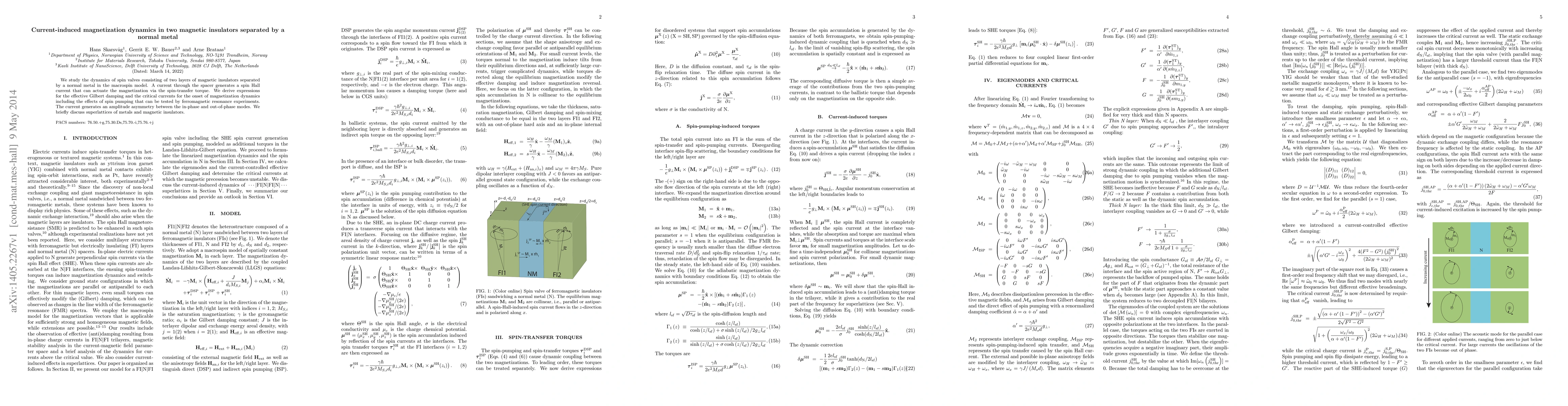 This paper investigates the magnetization dynamics in spin valves composed of two magnetic insulators separated by a normal metal, driven by a current-induced spin Hall effect. It derives expressions for effective Gilbert damping and critical currents, highlighting the effects of spin pumping and amplitude asymmetry, and suggests experimental verification via ferromagnetic resonance.