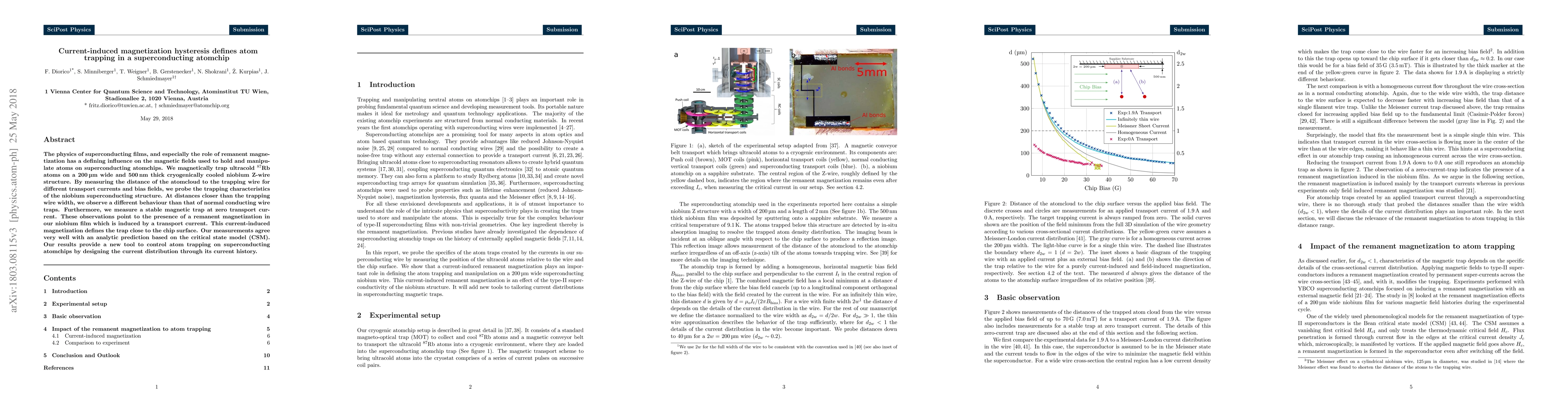 The physics of superconducting films, and especially the role of remnant magnetization has a defining influence on the magnetic fields used to hold and manipulate atoms on superconducting atomchips. We magnetically trap ultracold ^{87}Rb atoms on a 200{\mu}m wide and 500nm thick cryogenically cooled niobium Z wire structure. By measuring the distance of the atomcloud to the trapping wire for different transport currents and bias fields, we probe the trapping characteristics of the niobium superconducting structure. At distances closer than the trapping wire width, we observe a different behaviour than that of normal conducting wire traps. Furthermore, we measure a stable magnetic trap at zero transport current. These observations point to the presence of a remnant magnetization in our niobium film which is induced by a transport current. This current-induced magnetization defines the trap close to the chip surface. Our measurements agree very well with an analytic prediction based on the critical state model (CSM). Our results provide a new tool to control atom trapping on superconducting atomchips by designing the current distribution through its current history.