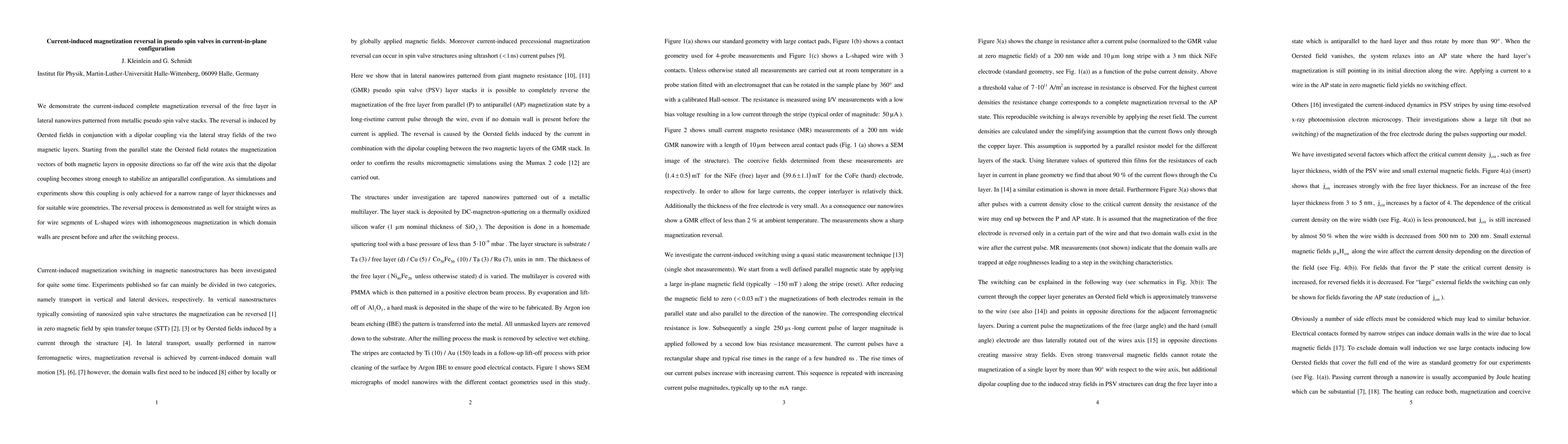 This paper demonstrates current-induced magnetization reversal in metallic pseudo spin valve nanowires using Oersted fields and dipolar coupling, showing successful reversal in both straight and L-shaped wire configurations, though it requires specific layer thicknesses and wire geometries.