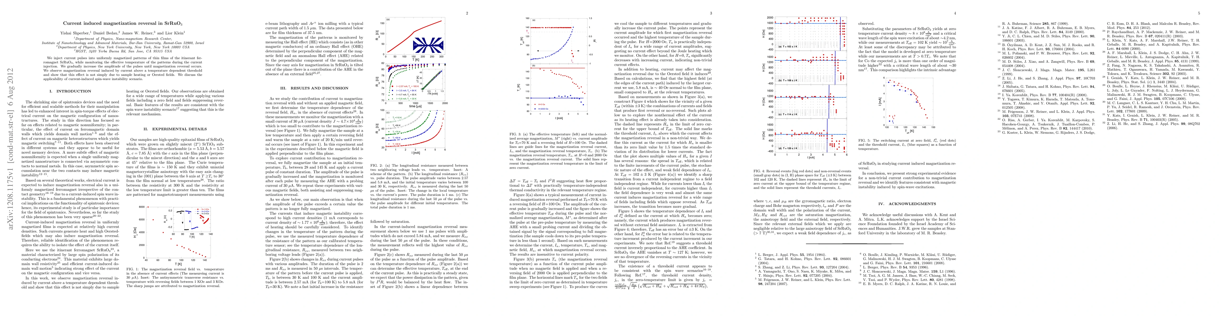 This study investigates current-induced magnetization reversal in SrRuO3 thin films by injecting current pulses and monitoring effective temperature changes. The results show that current can reverse magnetization above a temperature-dependent threshold, independent of sample heating or Oersted fields, supporting the current-induced spin-wave instability scenario.