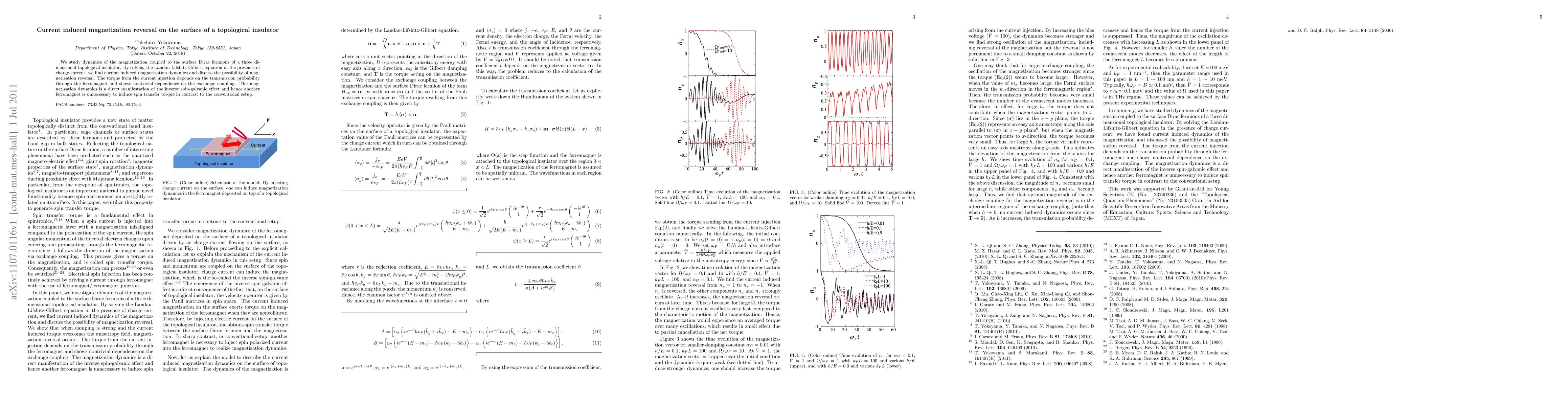This paper investigates the magnetization dynamics on a topological insulator's surface driven by a charge current, revealing current-induced magnetization reversal. The study highlights the inverse spin-galvanic effect, demonstrating that spin transfer torque can occur without an additional ferromagnet, relying on the transmission probability and exchange coupling.
