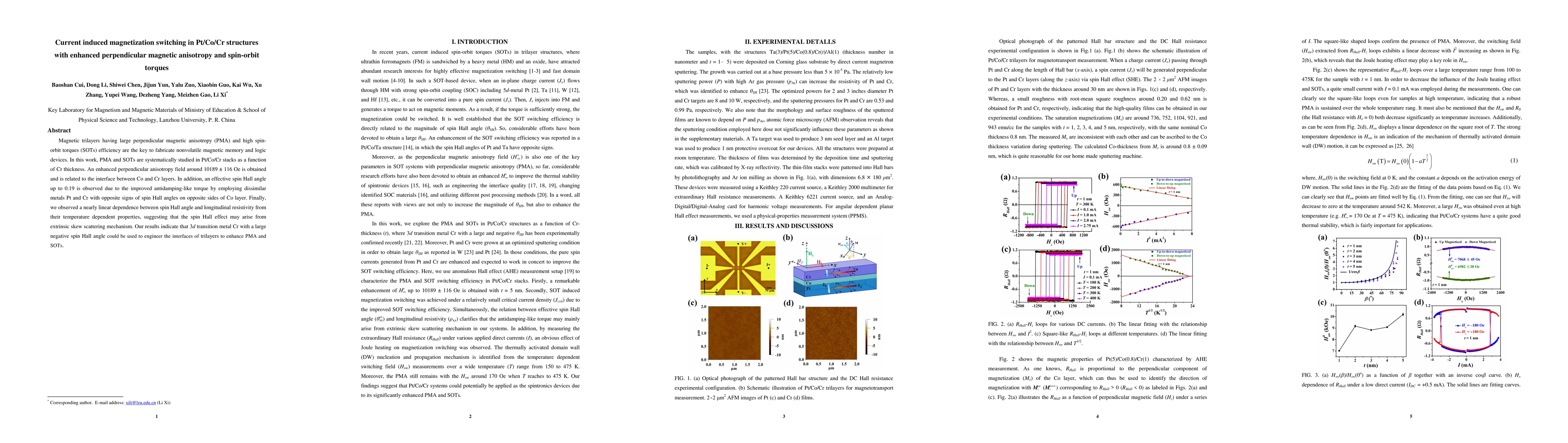 The research investigates Pt/Co/Cr magnetic trilayers, enhancing perpendicular magnetic anisotropy (PMA) and spin-orbit torques (SOTs) efficiency. Key findings include an enhanced PMA field of 10189 Oe due to Co-Cr interface and an effective spin Hall angle of 0.19. The study suggests Cr's large negative spin Hall angle can be used to engineer interfaces for improved memory and logic devices.