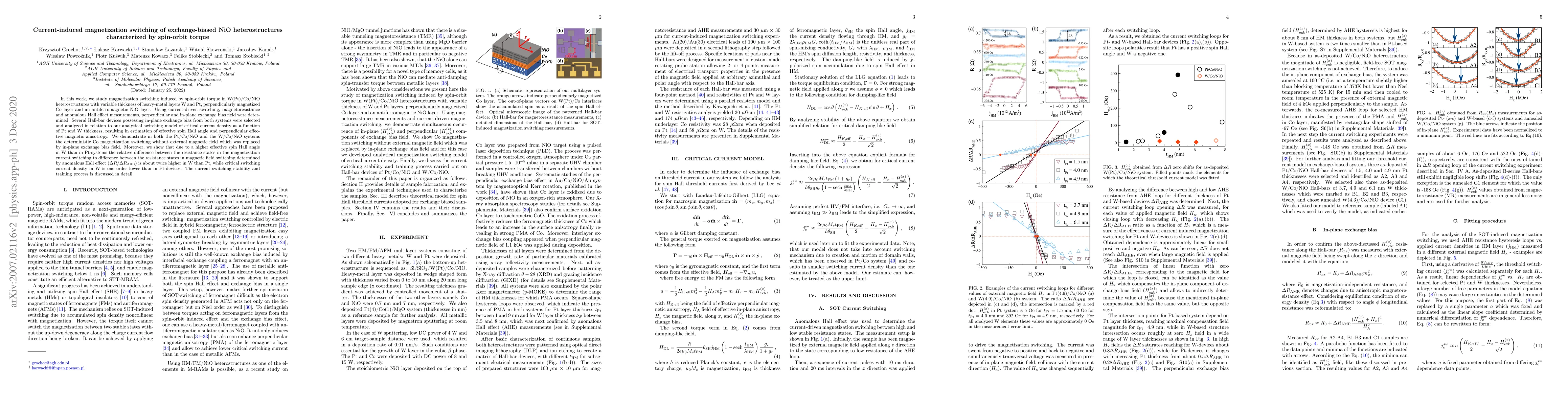 This paper investigates the magnetization switching in W(Pt)/Co/NiO heterostructures driven by spin-orbit torque, determining the effective spin Hall angle and magnetic anisotropy. The study finds that W-based systems exhibit higher relative resistance state differences and lower critical current densities compared to Pt-based systems, highlighting the influence of material choice on switching efficiency.