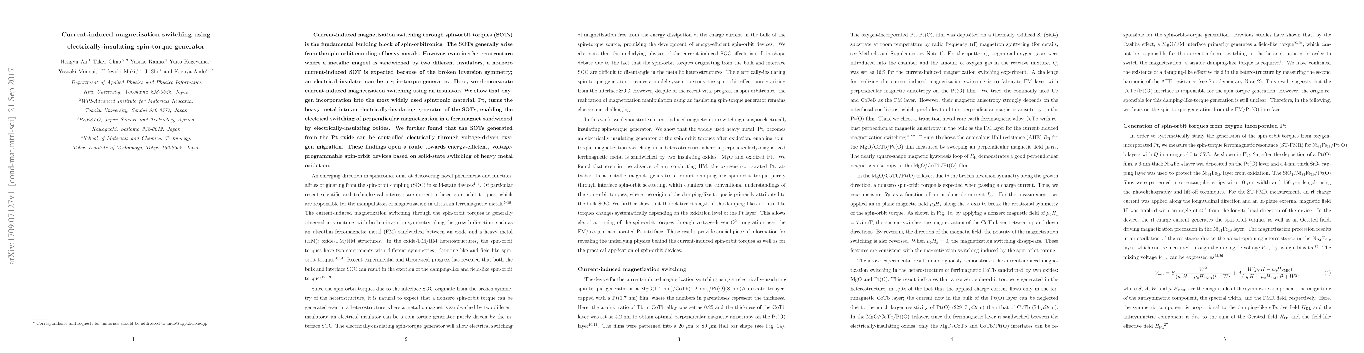 Current-induced magnetization switching through spin-orbit torques (SOTs) is the fundamental building block of spin-orbitronics. The SOTs generally arise from the spin-orbit coupling of heavy metals. However, even in a heterostructure where a metallic magnet is sandwiched by two different insulators, a nonzero current-induced SOT is expected because of the broken inversion symmetry; an electrical insulator can be a spin-torque generator. Here, we demonstrate current-induced magnetization switching using an insulator. We show that oxygen incorporation into the most widely used spintronic material, Pt, turns the heavy metal into an electrically-insulating generator of the SOTs, enabling the electrical switching of perpendicular magnetization in a ferrimagnet sandwiched by electrically-insulating oxides. We further found that the SOTs generated from the Pt oxide can be controlled electrically through voltage-driven oxygen migration. These findings open a route towards energy-efficient, voltage-programmable spin-orbit devices based on solid-state switching of heavy metal oxidation.