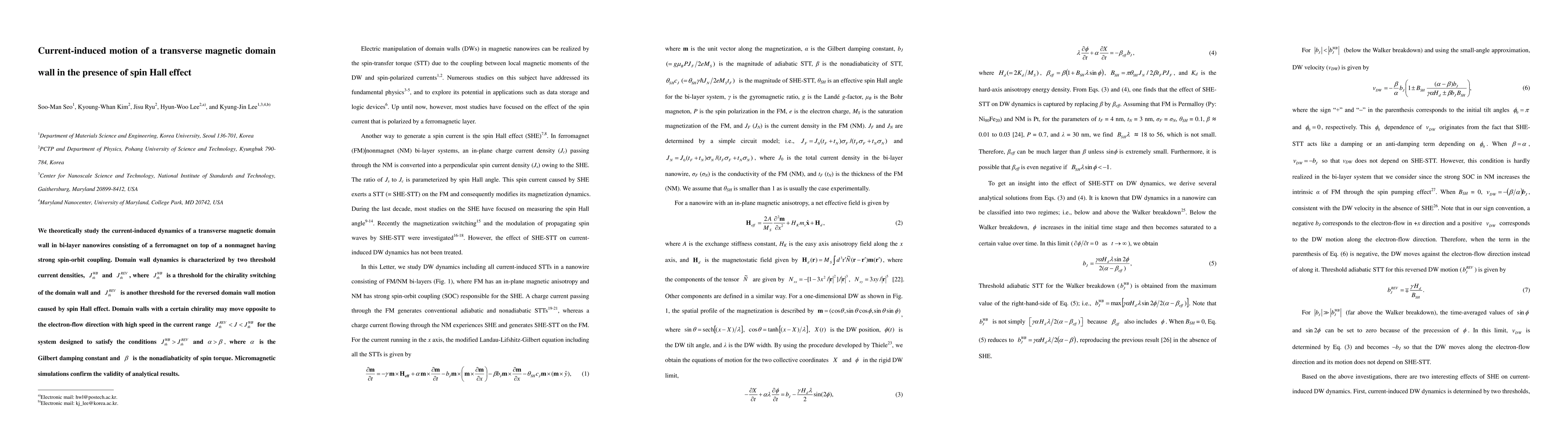 This research investigates the dynamics of a transverse magnetic domain wall in ferromagnetic-nonmagnetic bilayer nanowires under current-induced motion, focusing on the effects of spin Hall effect and threshold currents. Analytical and micromagnetic simulation results show domain walls can move against electron flow at specific current densities, demonstrating chirality switching and reversed motion thresholds.