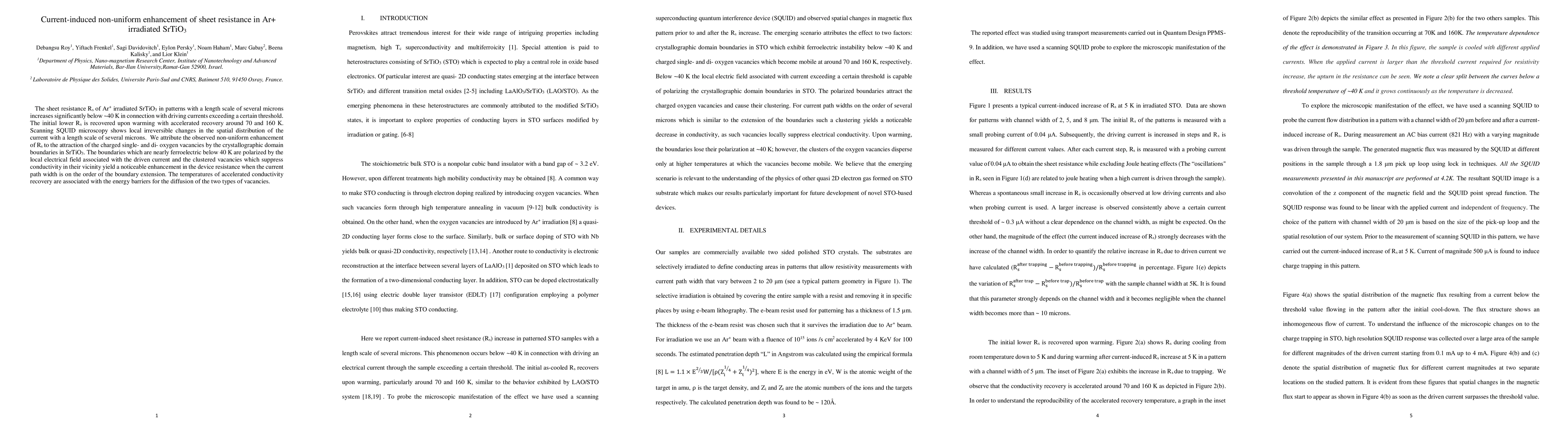 This study investigates the current-induced nonuniform enhancement of sheet resistance in Ar+ irradiated SrTiO3, finding significant increases below 40 K when currents surpass a threshold. The resistance recovers upon warming, particularly around 70 and 160 K, due to the diffusion of oxygen vacancies, which are attracted to ferroelectric domain boundaries.