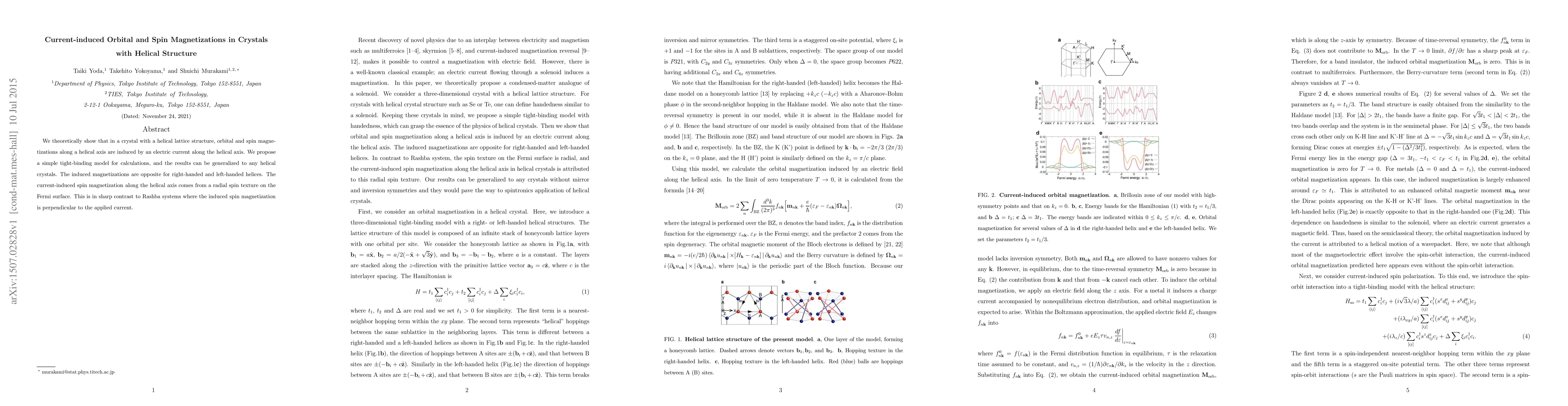 This paper theoretically demonstrates that electric current along the helical axis of a helical lattice crystal induces both orbital and spin magnetizations along the same axis, with opposite magnetizations for right- and left-handed helices. The study uses a tight-binding model to show that the current-induced spin magnetization arises from a radial spin texture on the Fermi surface.