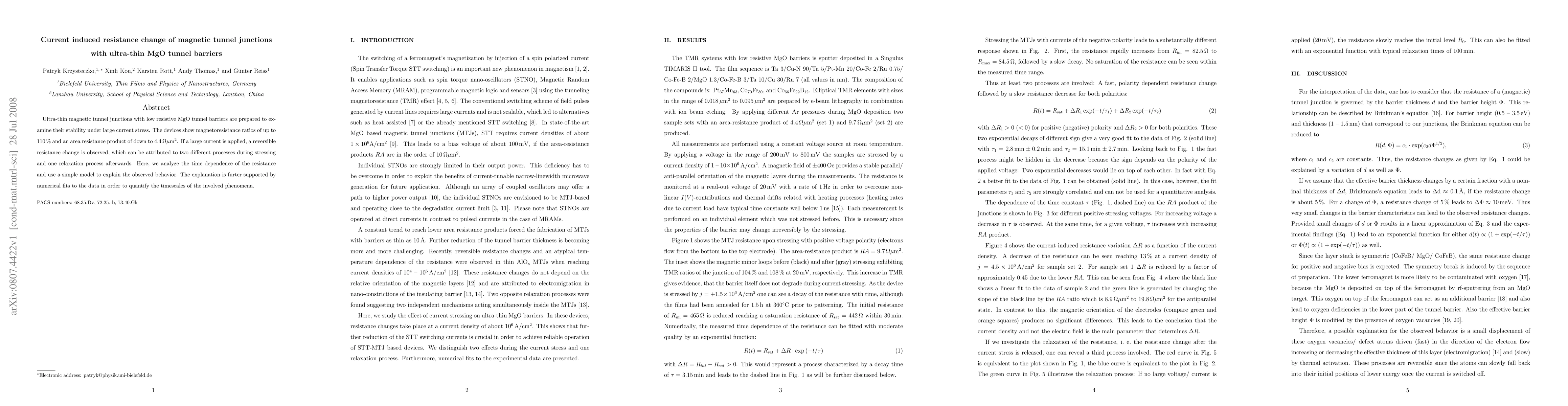 This paper investigates ultra-thin magnetic tunnel junctions with MgO barriers, revealing high magnetoresistance ratios and low area resistance. Under large current stress, reversible resistance changes occur due to two stressing processes and a subsequent relaxation, analyzed through a simple model and numerical fits to quantify involved timescales.