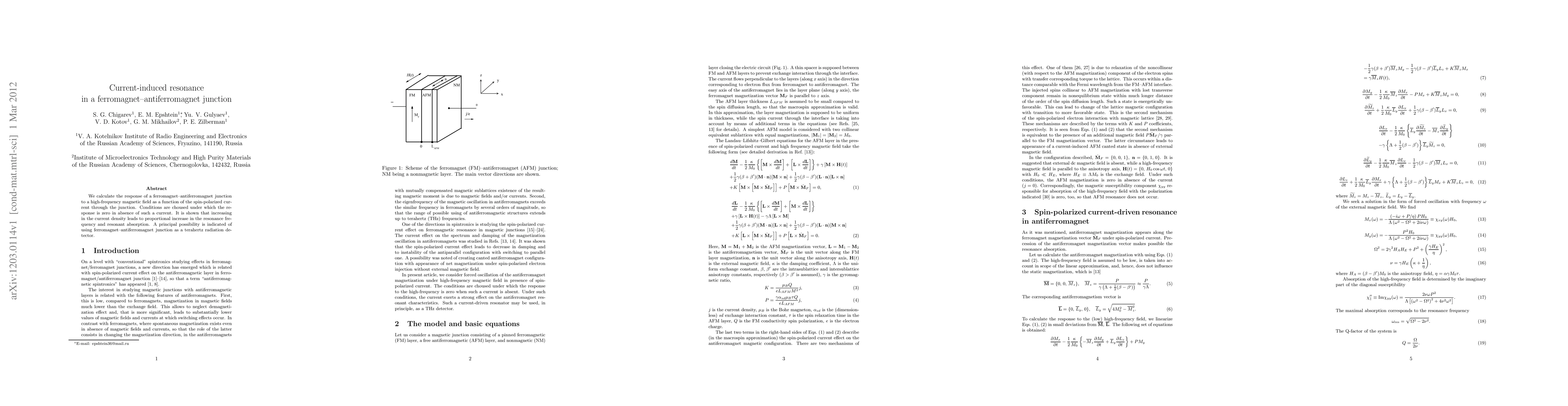 The paper presents a theoretical model describing the response of a ferromagnet-antiferromagnet junction to high-frequency magnetic fields under spin-polarized current, identifying current-induced resonance as a potential application for terahertz radiation detection.