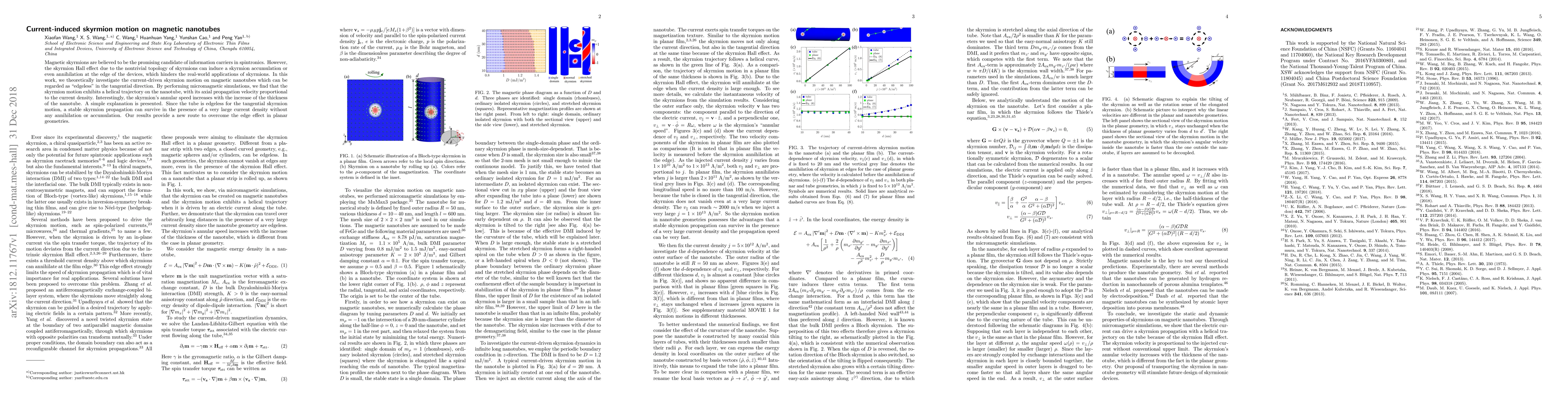 This paper investigates current-driven skyrmion motion on magnetic nanotubes, finding a helical trajectory and stable propagation without edge effects, offering a solution to skyrmion accumulation issues in planar devices. The study uses micromagnetic simulations to demonstrate that skyrmion velocity scales with current density and tube thickness.