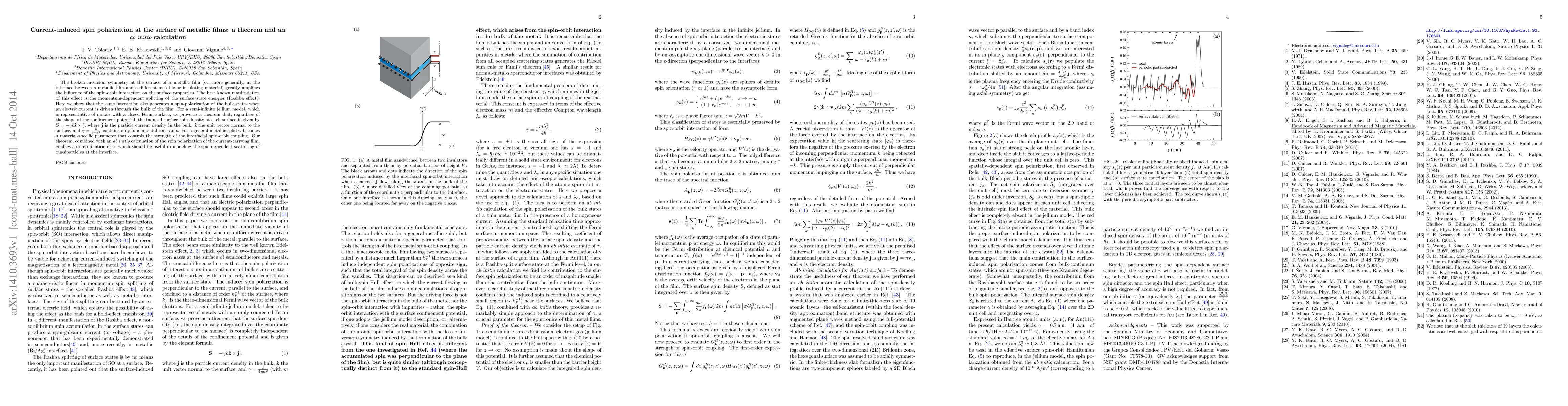 This paper proves a theorem showing that a current-induced spin polarization occurs at the surface of metallic films due to broken inversion symmetry and spin-orbit interaction. The theorem provides a formula for the induced surface spin density, and an ab initio calculation determines the material-specific parameter for the strength of this effect.