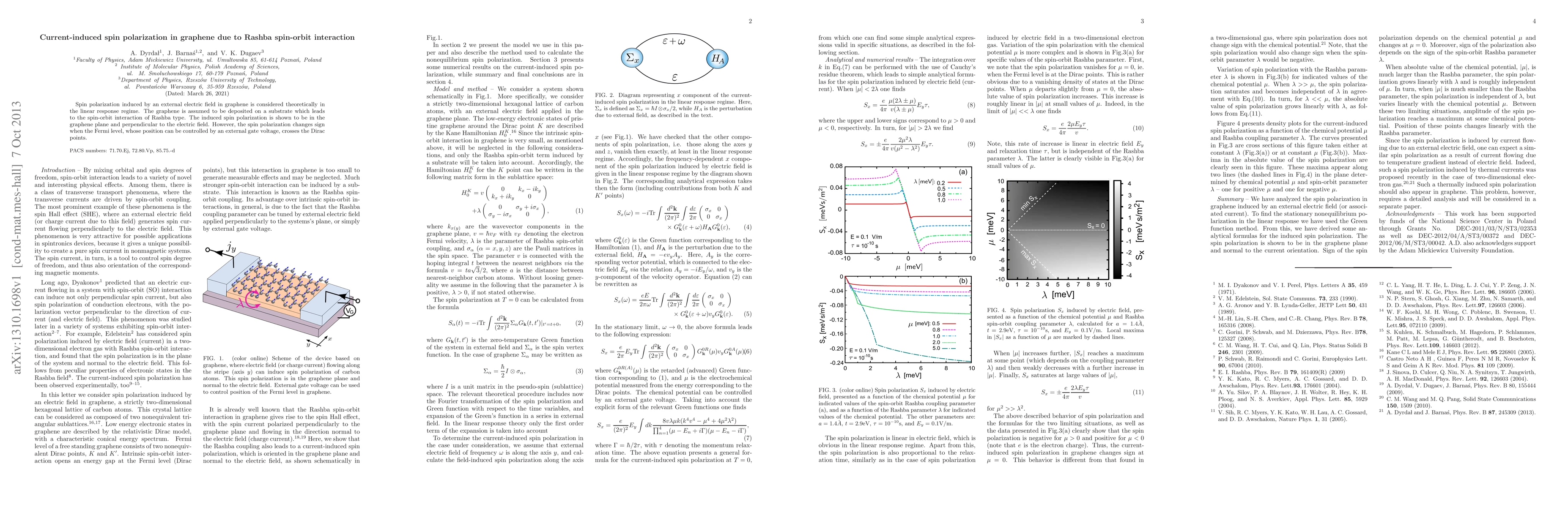 This paper theoretically investigates the spin polarization in graphene caused by an external electric field, focusing on the Rashba spin-orbit interaction. It reveals that the induced spin polarization occurs in the graphene plane and perpendicular to the field, with its sign reversing when the Fermi level crosses the Dirac points.