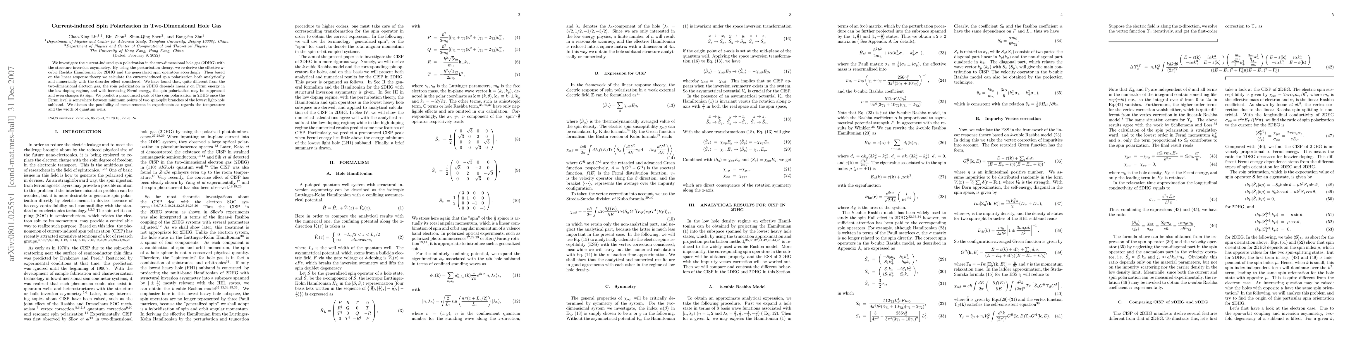 This research investigates current-induced spin polarization in a two-dimensional hole gas (2DHG) using perturbation theory and linear response theory, revealing a linear dependence on Fermi energy in low doping regimes. It predicts a peak spin polarization at specific Fermi levels, contrasting with behaviors in two-dimensional electron gas.