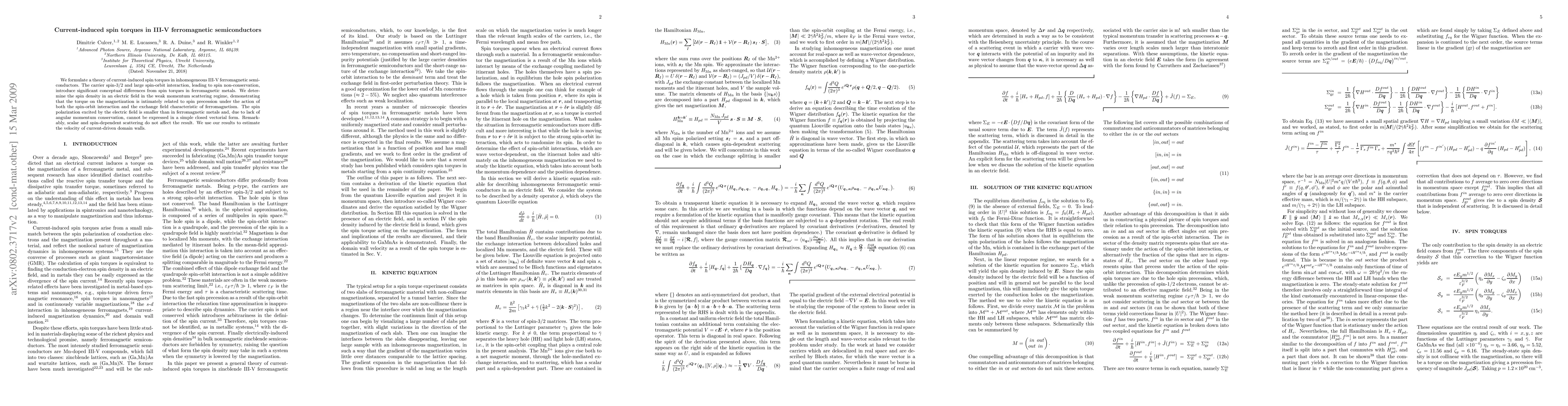 This paper develops a theoretical framework for current-induced spin torques in III-V ferromagnetic semiconductors, highlighting the unique effects of spin-orbit interaction and non-conservation of spin. It estimates the velocity of current-driven domain walls, showing that spin polarization is smaller and less straightforward compared to ferromagnetic metals.
