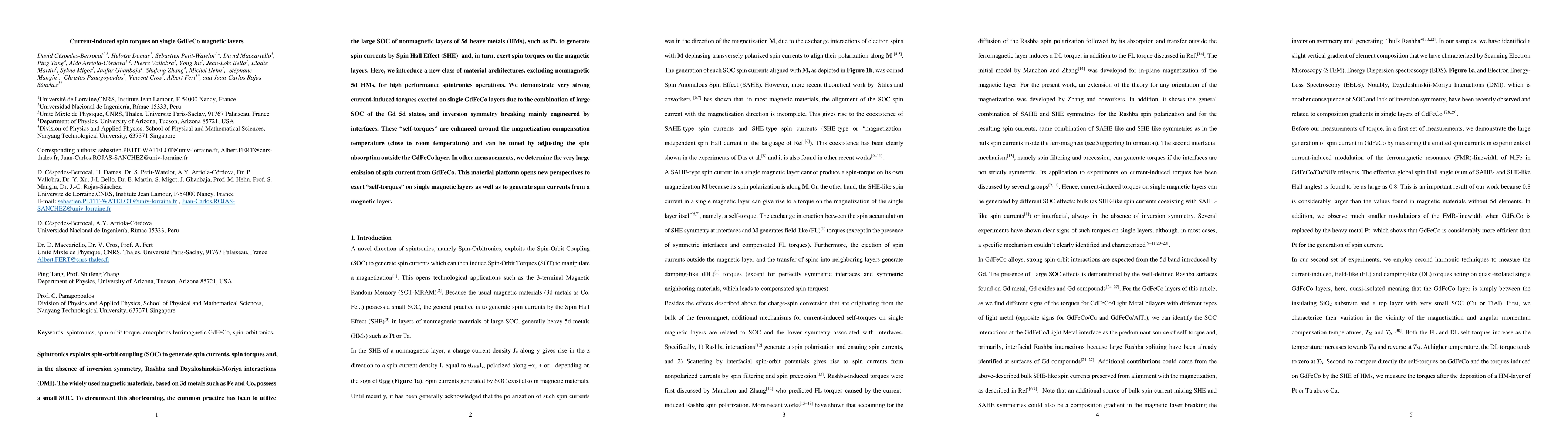 Spintronics exploits spin-orbit coupling (SOC) to generate spin currents, spin torques, and, in the absence of inversion symmetry, Rashba, and Dzyaloshinskii-Moriya interactions (DMI). The widely used magnetic materials, based on 3d metals such as Fe and Co, possess a small SOC. To circumvent this shortcoming, the common practice has been to utilize the large SOC of nonmagnetic layers of 5d heavy metals (HMs), such as Pt, to generate spin currents by Spin Hall Effect (SHE) and, in turn, exert spin torques on the magnetic layers. Here, we introduce a new class of material architectures, excluding nonmagnetic 5d HMs, for high-performance spintronics operations. We demonstrate very strong current-induced torques exerted on single GdFeCo layers due to the combination of large SOC of the Gd 5d states, and inversion symmetry breaking mainly engineered by interfaces. These "self-torques" are enhanced around the magnetization compensation temperature (close to room temperature) and can be tuned by adjusting the spin absorption outside the GdFeCo layer. In other measurements, we determine the very large emission of spin current from GdFeCo. This material platform opens new perspectives to exert "self-torques" on single magnetic layers as well as to generate spin currents from a magnetic layer.