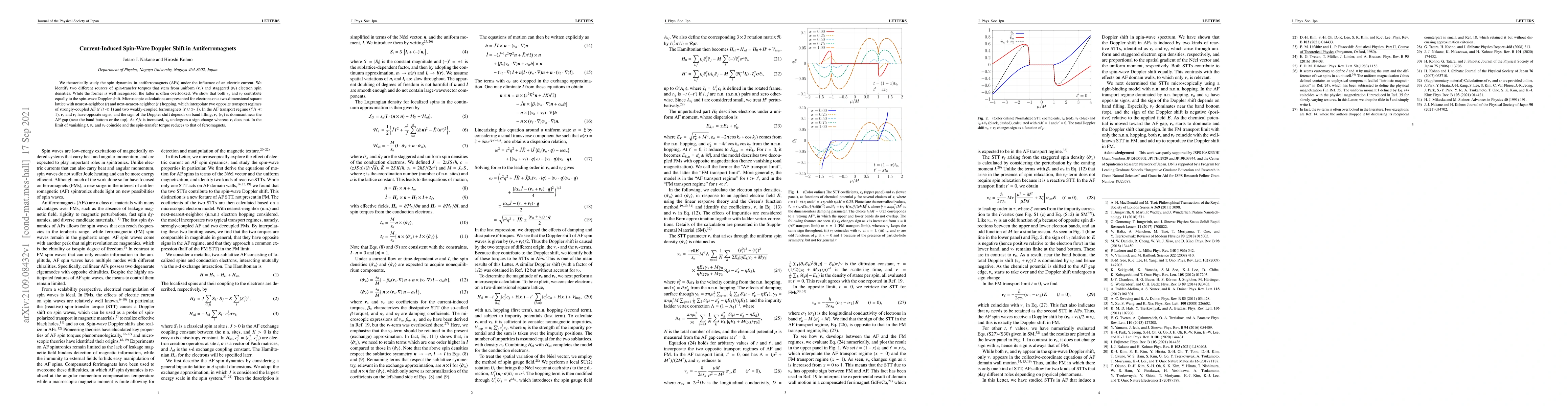 We theoretically study the spin dynamics in antiferromagnets (AFs)under the influence of an electric current. We identify two different sources of spin-transfer torques that stem from uniform (${\boldsymbol v}_n$) and staggered (${\boldsymbol v}_\ell$) electron spin densities. While the former is well recognized, the latter is often overlooked. We show that both ${\boldsymbol v}_n$ and ${\boldsymbol v}_\ell$ contribute equally to the spin-wave Doppler shift. Microscopic calculations are presented for electrons on a two-dimensional square lattice with nearest-neighbor ($t$) and next-nearest-neighbor ($t'$) hopping, which interpolate two opposite transport regimes of strongly-coupled AF ($t'/t \ll 1$) and two weakly coupled ferromagnets ($t'/t \gg 1$). In the AF transport regime ($t'/t \ll 1$), ${\boldsymbol v}_n$ and ${\boldsymbol v}_\ell$ have opposite signs, and the sign of the Doppler shift depends on band filling; ${\boldsymbol v}_n$ (${\boldsymbol v}_\ell$) is dominant near the AF gap (near the band bottom or the top). As $t'/t$ is increased, ${\boldsymbol v}_n$ undergoes a sign change whereas ${\boldsymbol v}_\ell$ does not. In the limit of vanishing $t$, ${\boldsymbol v}_n$ and ${\boldsymbol v}_\ell$ coincide and the spin-transfer torque reduces to that of ferromagnets.