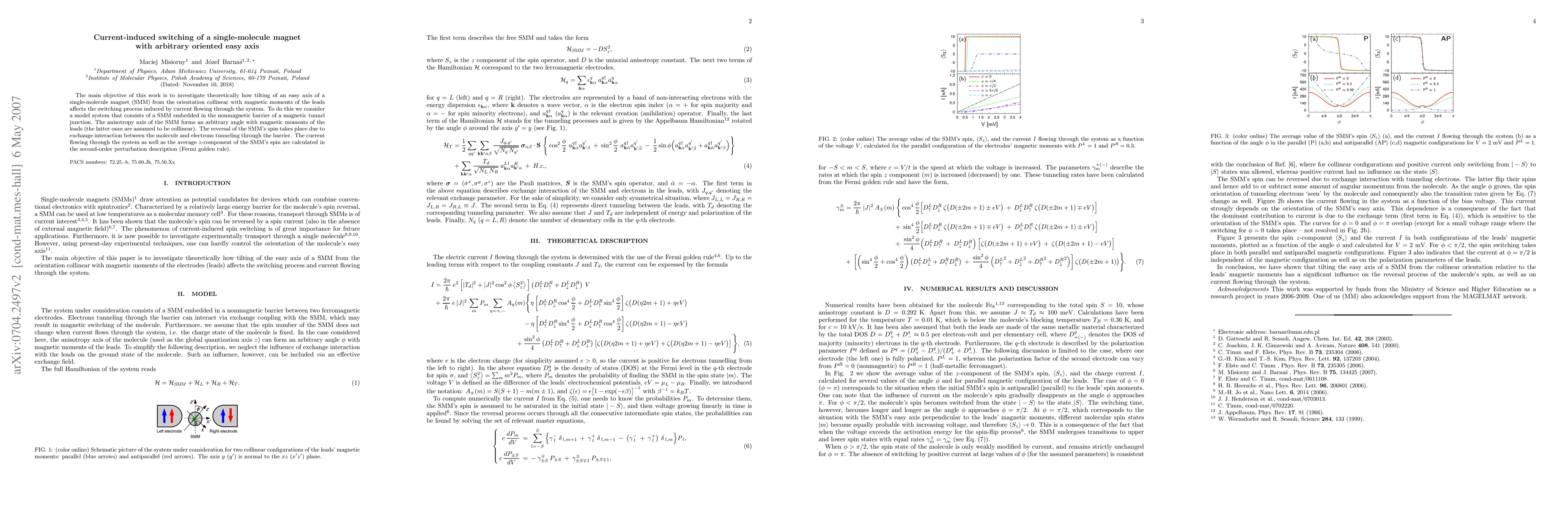 The main objective of this work is to investigate theoretically how tilting of an easy axis of a single-molecule magnet (SMM) from the orientation collinear with magnetic moments of the leads affects the switching process induced by current flowing through the system. To do this we consider a model system that consists of a SMM embedded in the nonmagnetic barrier of a magnetic tunnel junction. The anisotropy axis of the SMM forms an arbitrary angle with magnetic moments of the leads (the latter ones are assumed to be collinear). The reversal of the SMM's spin takes place due to exchange interaction between the molecule and electrons tunneling through the barrier. The current flowing through the system as well as the average z-component of the SMM's spin are calculated in the second-order perturbation description (Fermi golden rule).