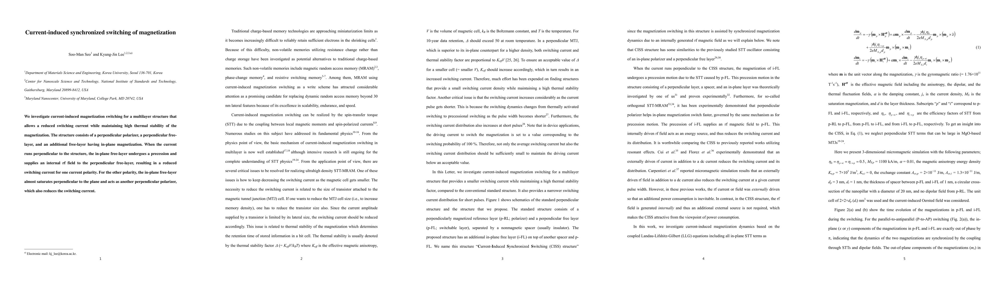 This research explores a multilayer structure that utilizes current-induced magnetization switching, featuring a reduced switching current and high thermal stability. The configuration includes a perpendicular polarizer and two free-layers, one with in-plane magnetization, which precesses to generate an internal rf field, thus lowering the switching current for one current direction.