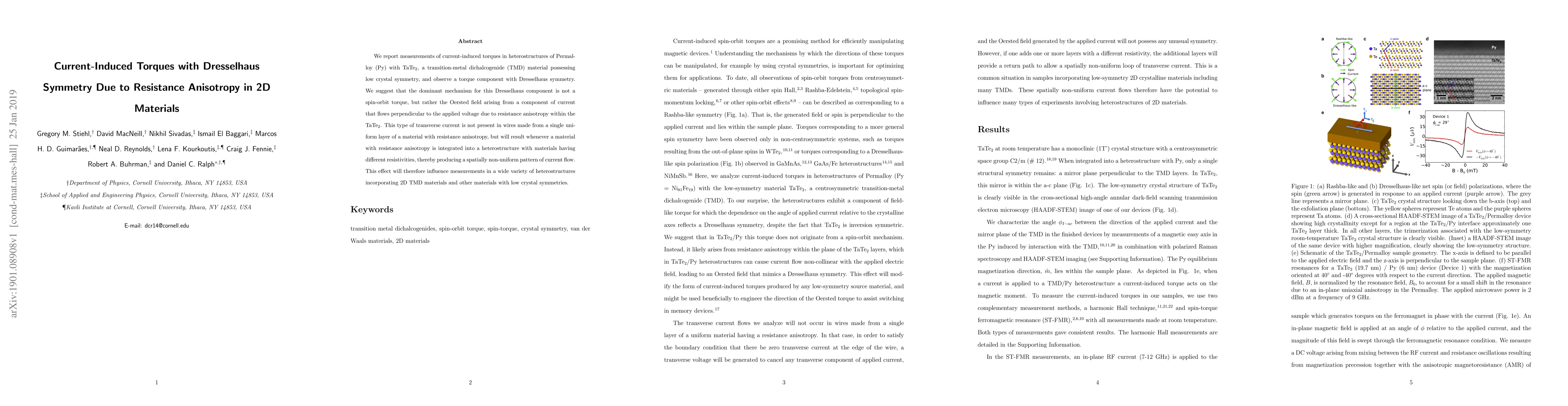 We report measurements of current-induced torques in heterostructures of Permalloy (Py) with TaTe$_2$, a transition-metal dichalcogenide (TMD) material possessing low crystal symmetry, and observe a torque component with Dresselhaus symmetry. We suggest that the dominant mechanism for this Dresselhaus component is not a spin-orbit torque, but rather the Oersted field arising from a component of current that flows perpendicular to the applied voltage due to resistance anisotropy within the TaTe$_2$. This type of transverse current is not present in wires made from a single uniform layer of a material with resistance anisotropy, but will result whenever a material with resistance anisotropy is integrated into a heterostructure with materials having different resistivities, thereby producing a spatially non-uniform pattern of current flow. This effect will therefore influence measurements in a wide variety of heterostructures incorporating 2D TMD materials and other materials with low crystal symmetries.
