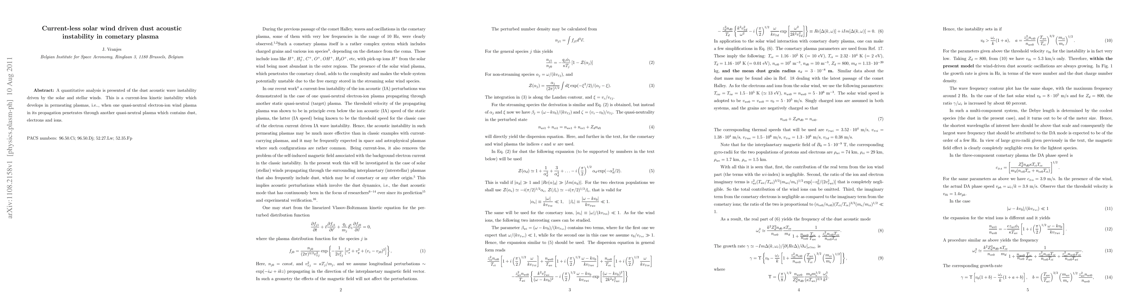 Two-line summary: This paper quantitatively analyzes a current-less kinetic instability in cometary plasmas where dust acoustic waves are driven by solar and stellar winds, occurring when an electron-ion wind plasma penetrates a dust-containing quasi-neutral plasma. The study focuses on the interaction dynamics between these two plasma environments.
