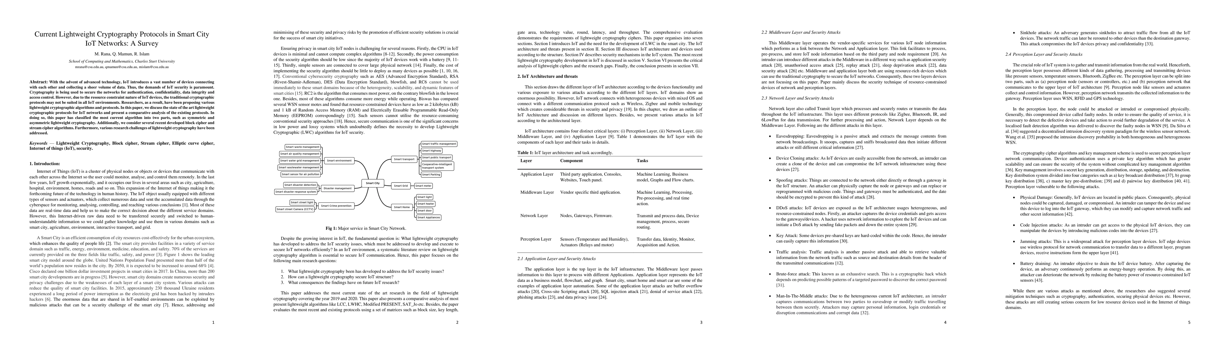 This paper surveys state-of-the-art lightweight cryptographic protocols for securing IoT networks in smart cities, focusing on both symmetric and asymmetric algorithms. It provides a comparative analysis of existing protocols and highlights recent developments in block and stream ciphers, while also addressing ongoing research challenges.