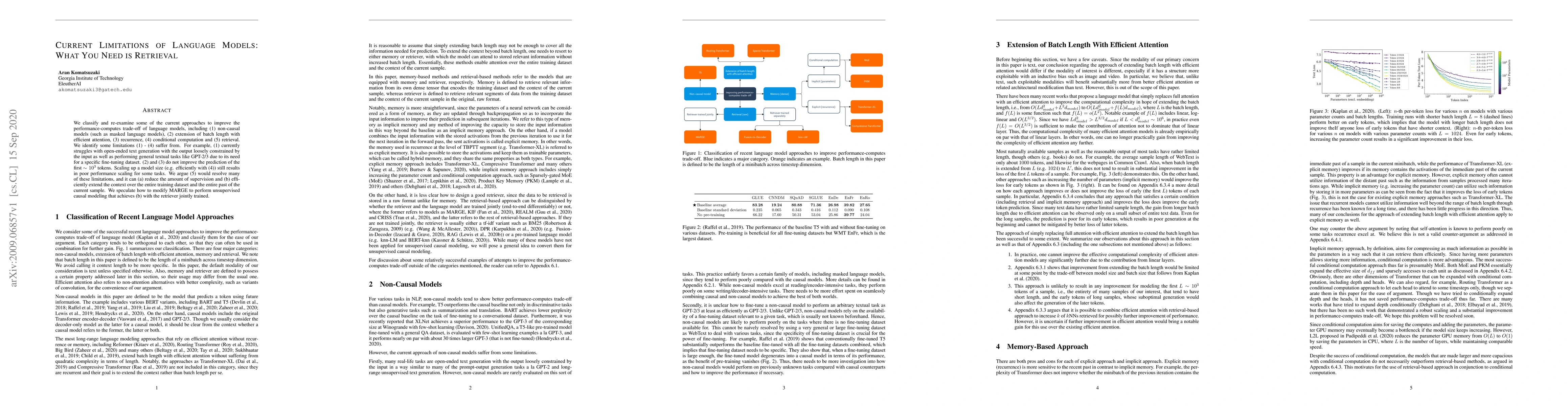We classify and re-examine some of the current approaches to improve the performance-computes trade-off of language models, including (1) non-causal models (such as masked language models), (2) extension of batch length with efficient attention, (3) recurrence, (4) conditional computation and (5) retrieval. We identify some limitations (1) - (4) suffer from. For example, (1) currently struggles with open-ended text generation with the output loosely constrained by the input as well as performing general textual tasks like GPT-2/3 due to its need for a specific fine-tuning dataset. (2) and (3) do not improve the prediction of the first $\sim 10^3$ tokens. Scaling up a model size (e.g. efficiently with (4)) still results in poor performance scaling for some tasks. We argue (5) would resolve many of these limitations, and it can (a) reduce the amount of supervision and (b) efficiently extend the context over the entire training dataset and the entire past of the current sample. We speculate how to modify MARGE to perform unsupervised causal modeling that achieves (b) with the retriever jointly trained.