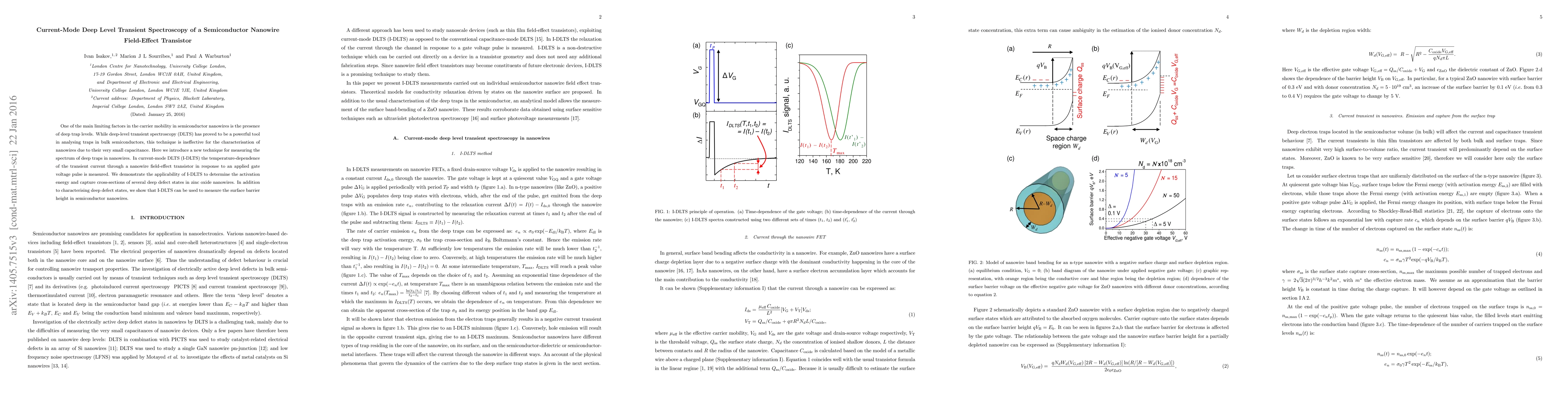This paper introduces current-mode deep-level transient spectroscopy (I-DLTS) to analyze deep trap levels in semiconductor nanowires, overcoming the limitations of traditional DLTS. The technique measures the temperature-dependent transient current in response to gate voltage pulses, demonstrating its effectiveness in determining defect states and surface barrier heights in zinc oxide nanowires.