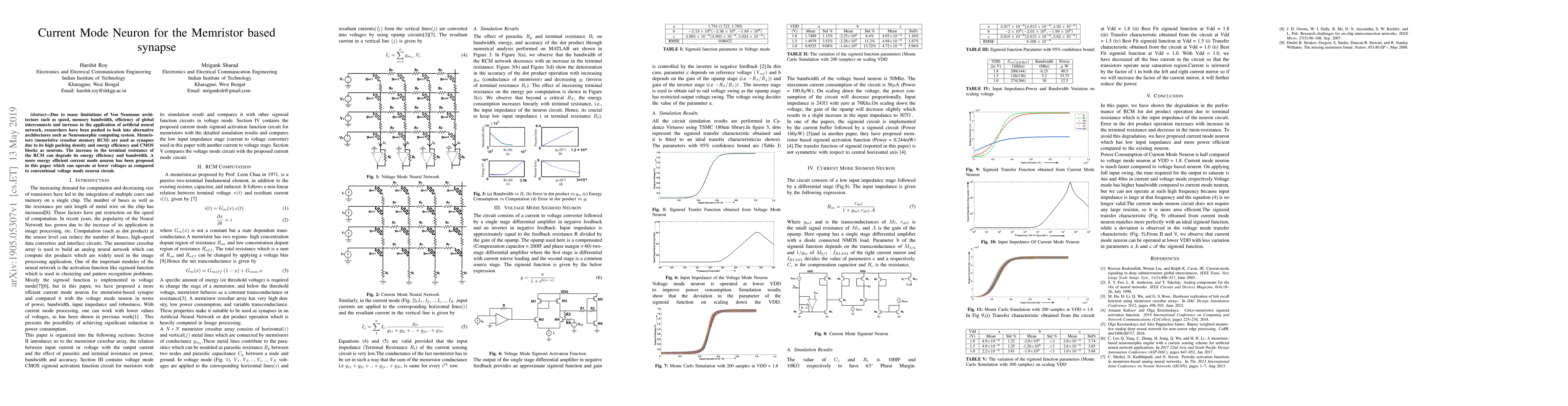 Due to many limitations of Von Neumann architecture such as speed, memory bandwidth, efficiency of global interconnects and increase in the application of artificial neural network, researchers have been pushed to look into alternative architectures such as Neuromorphic computing system. Memristors (memristive crossbar memory RCM) are used as synapses due to its high packing density and energy efficiency and CMOS blocks as neurons. The increase in the terminal resistance of the RCM can degrade its energy efficiency and bandwidth. A more energy efficient current mode neuron has been proposed in this paper which can operate at lower voltages as compared to conventional voltage mode neuron circuit.