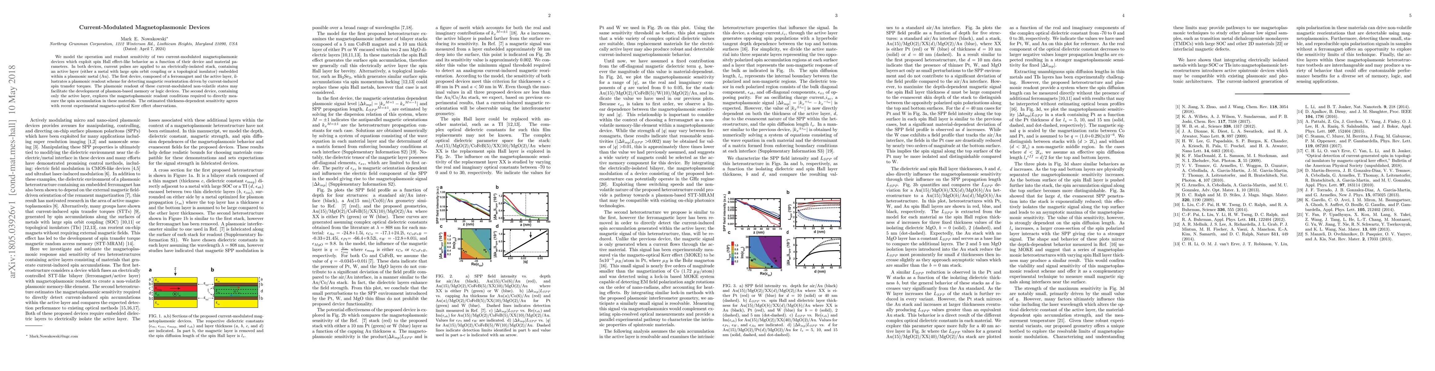 This paper models the operation of two current-modulated magnetoplasmonic devices utilizing spin Hall effect-like behavior. The first device uses a ferromagnet and an active layer to detect magnetic reorientation via plasmonic readout, potentially aiding in the development of plasmon-based memory or logic devices. The second device measures spin accumulation in active layers directly, with sensitivity estimates matching experimental observations.