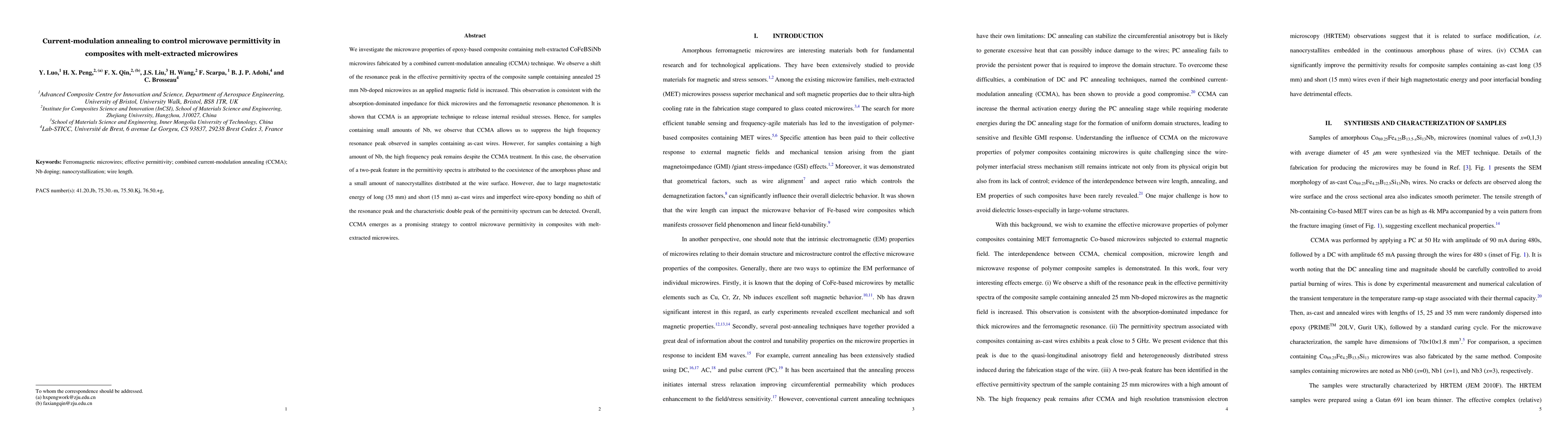 This study explores the microwave permittivity of epoxy-based composites with melt-extracted microwires using current-modulation annealing. The technique allows for the suppression of high-frequency resonance peaks in composites with low Nb doping, while high Nb doping retains the peak due to amorphous phase and nanocrystallites.