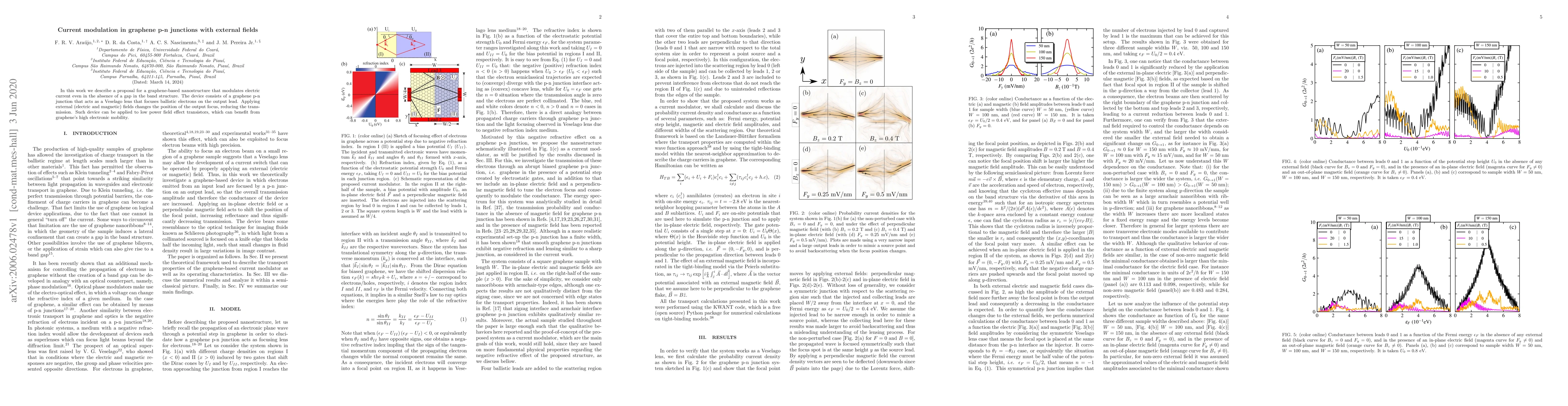 This paper proposes a graphene-based nanostructure with a p-n junction that modulates electric current without a band gap, functioning as a Veselago lens to focus electrons. External electric and magnetic fields can shift the electron focus, reducing transmission, potentially enabling low power field effect transistors leveraging graphene's high mobility.