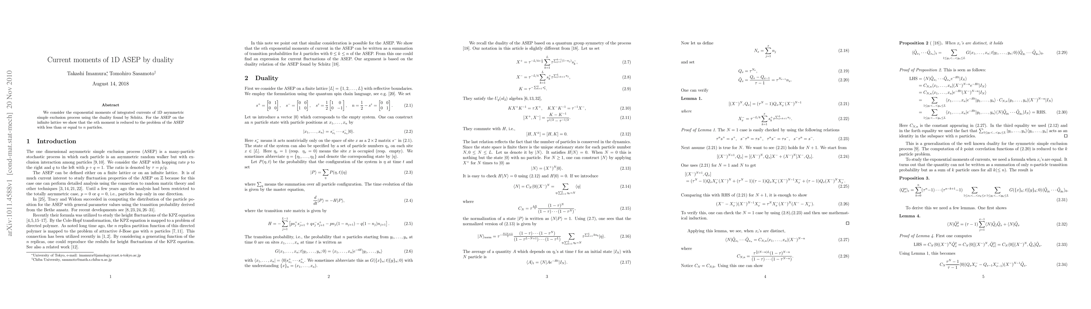 This paper explores the exponential moments of integrated currents in the 1D asymmetric simple exclusion process (ASEP) via Schütz's duality. The authors demonstrate that the $n$th moment of the infinite lattice ASEP can be simplified to the problem of a finite ASEP with up to $n$ particles.