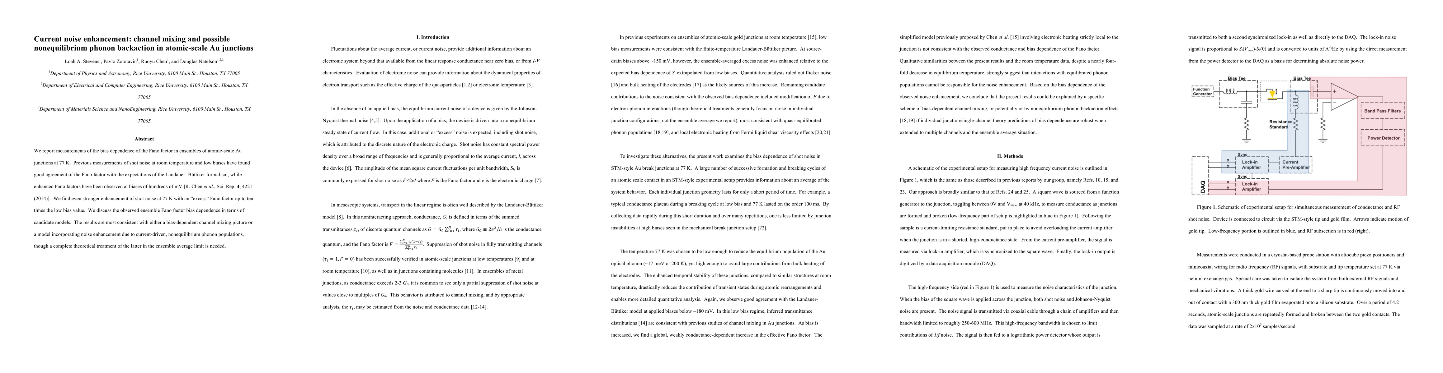 This study investigates the bias-dependent enhancement of the Fano factor in atomic-scale gold junctions at 77 K, revealing substantial shot noise increase. The results support either a bias-dependent channel mixing model or a phonon backaction model due to nonequilibrium phonon populations, though theoretical modeling of the latter remains incomplete.