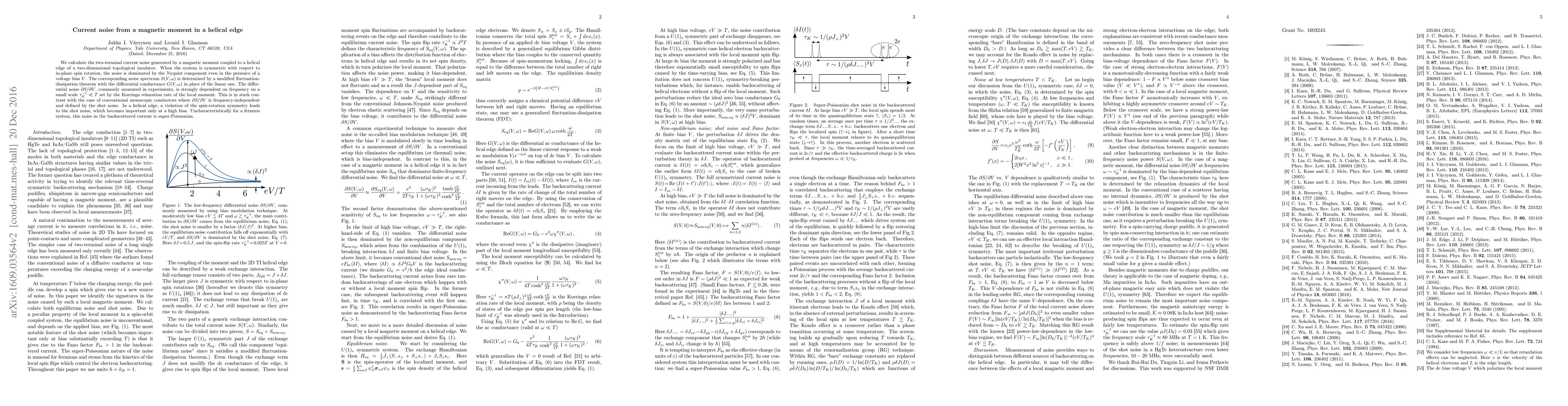 This paper investigates the current noise from a magnetic moment in a helical edge of a two-dimensional topological insulator, finding that the noise is dominated by the Nyquist component and is frequency-dependent due to the Korringa relaxation rate. Unlike conventional conductors, the noise in the helical edge can be super-Poissonian and shot noise emerges only at high biases when spin-rotation symmetry is violated.