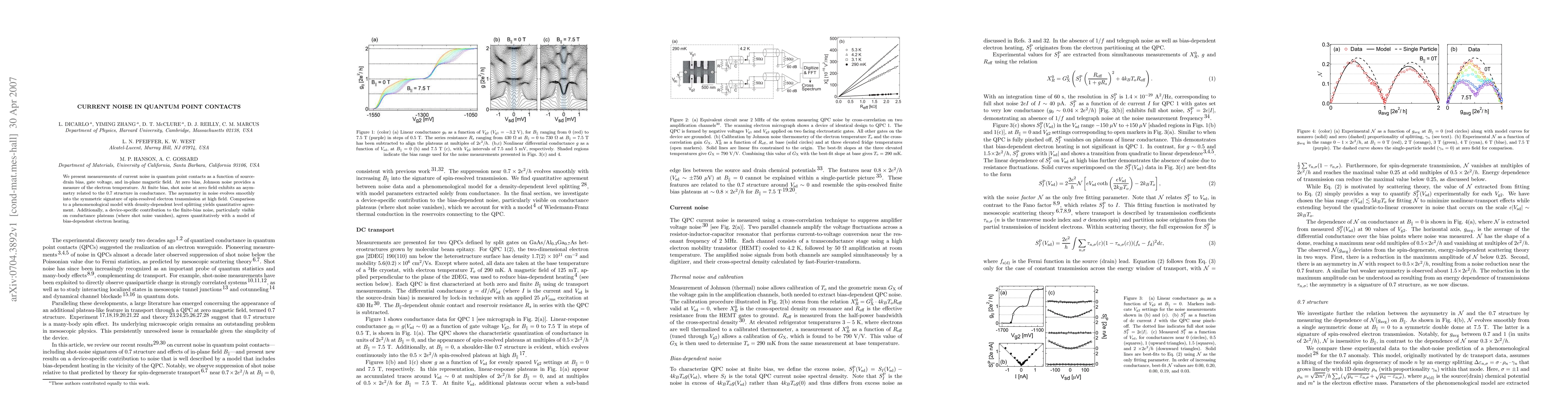 We present measurements of current noise in quantum point contacts as a function of source-drain bias, gate voltage, and in-plane magnetic field. At zero bias, Johnson noise provides a measure of the electron temperature. At finite bias, shot noise at zero field exhibits an asymmetry related to the 0.7 structure in conductance. The asymmetry in noise evolves smoothly into the symmetric signature of spin-resolved electron transmission at high field. Comparison to a phenomenological model with density-dependent level splitting yields quantitative agreement. Additionally, a device-specific contribution to the finite-bias noise, particularly visible on conductance plateaus (where shot noise vanishes), agrees quantitatively with a model of bias-dependent electron heating.