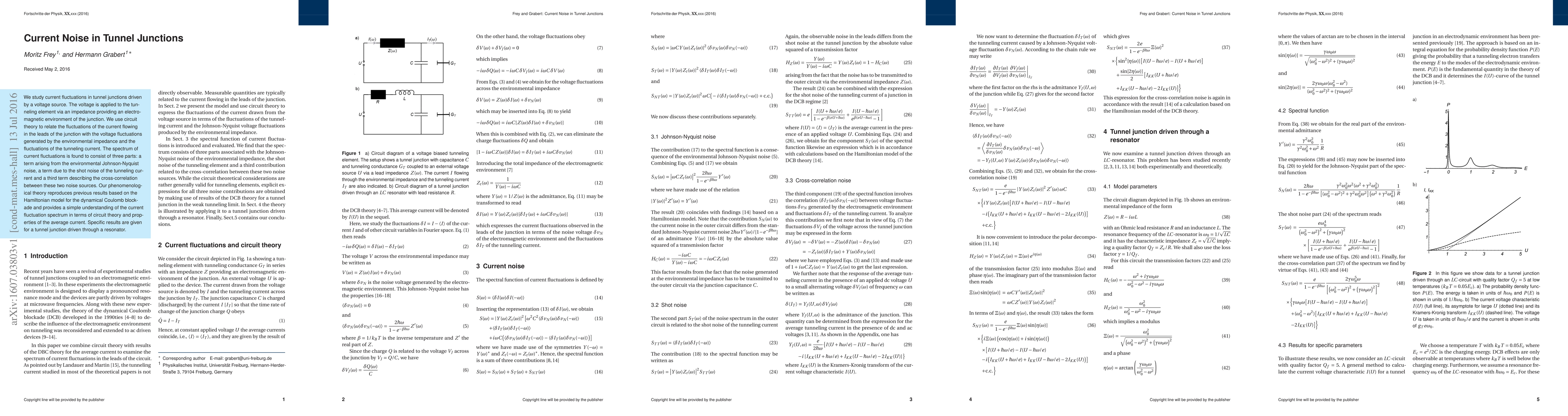 This paper investigates current fluctuations in tunnel junctions under voltage, linking them to environmental impedance and tunneling current noise. The current fluctuation spectrum comprises Johnson-Nyquist noise, shot noise, and cross-correlation terms, with the theory providing a circuit-based understanding of these phenomena.